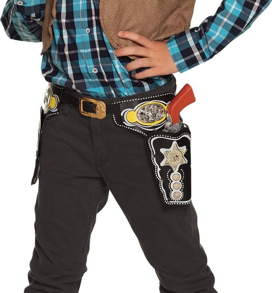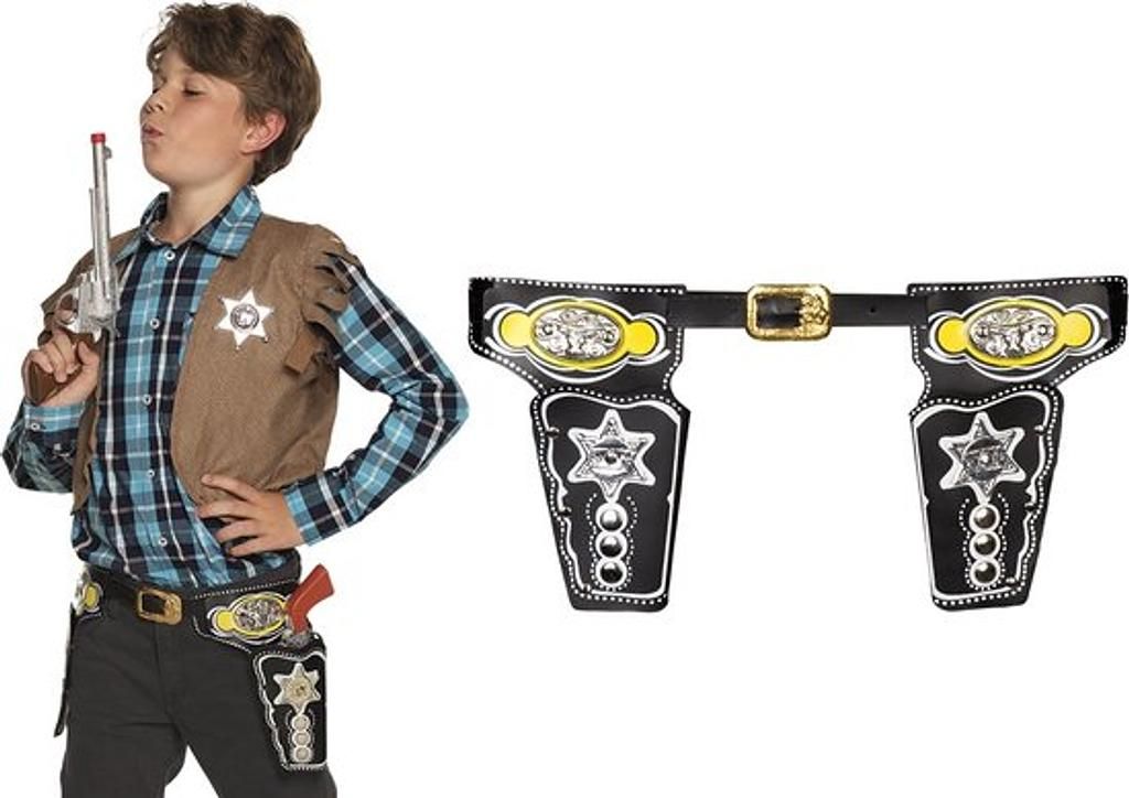 With this sheriff’s double holster from Boland, your child is perfectly equipped for exciting adventures in the Wild West! The leather-look belt is approximately 103 cm long and has room for two toy pistols (not included). Two sheriff stars and the classic black and yellow color scheme complete the look.