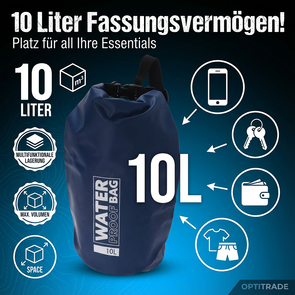 This waterproof dry bag was specially designed to protect your belongings under extreme conditions. With a capacity of 10 liters, the dry bag offers ample space for mobile phones, keys, clothing, or other essential items that you need to keep dry.