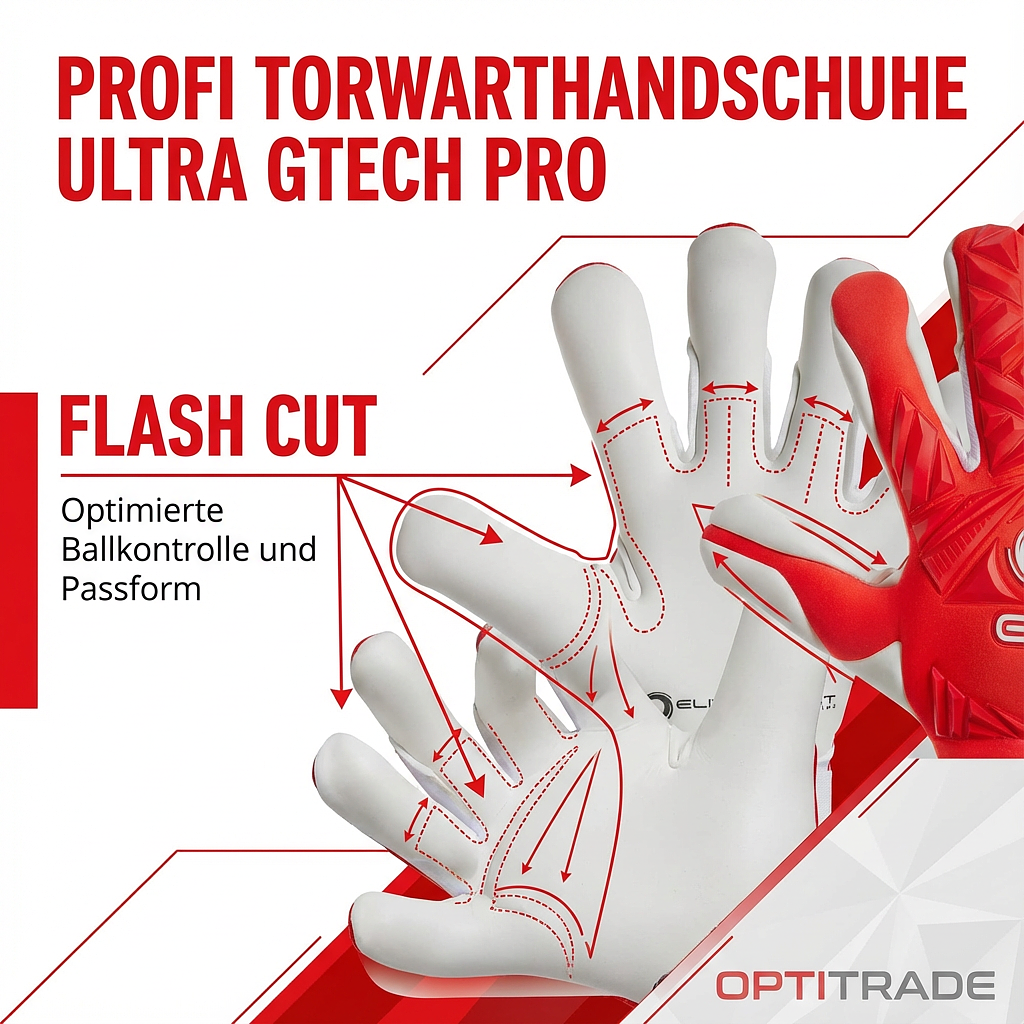 The core of these gloves is the impressive 4 mm thick Ultra GTech Pro latex palm. This premium latex ensures superior grip and makes these gloves ideal all-weather gloves. The 4 mm back padding and moisture-wicking inner lining keep your hands comfortable and dry, prevent slippage, and guarantee full control throughout the game. Design and Construction: The special Flash Cut palm design significantly improves ball control. The back of the hand is made of 3D-embossed, 4 mm durable rubber on a foamed hybrid CR, providing additional stability and protection. Although no separate finger support is integrated, the close-fitting hybrid CR and latex wrapping provides natural support to reduce finger strain.