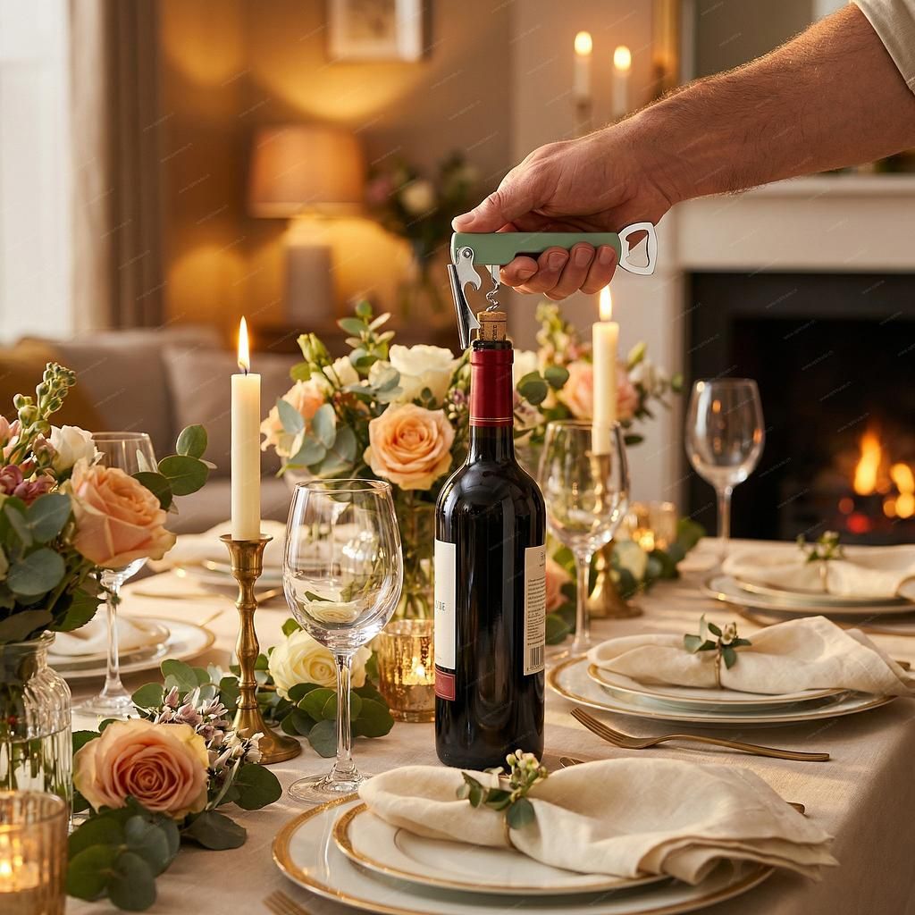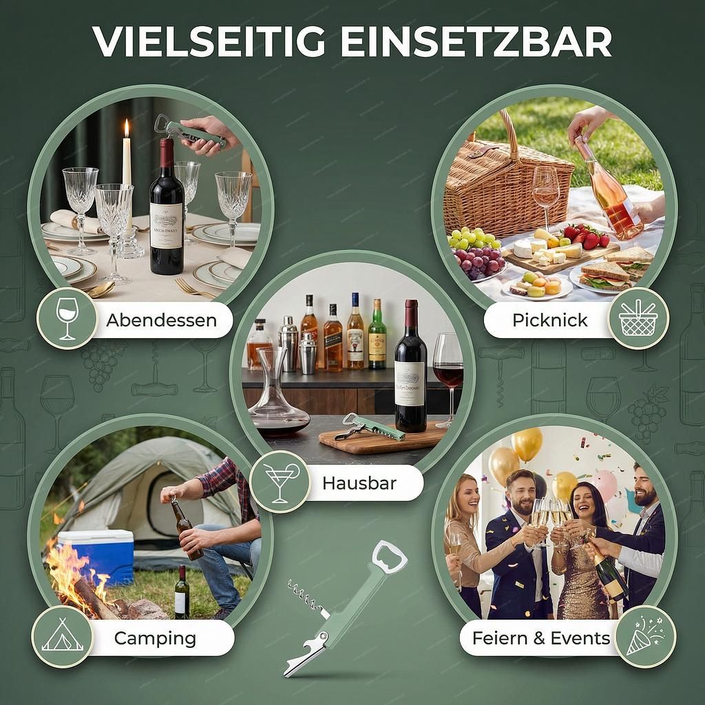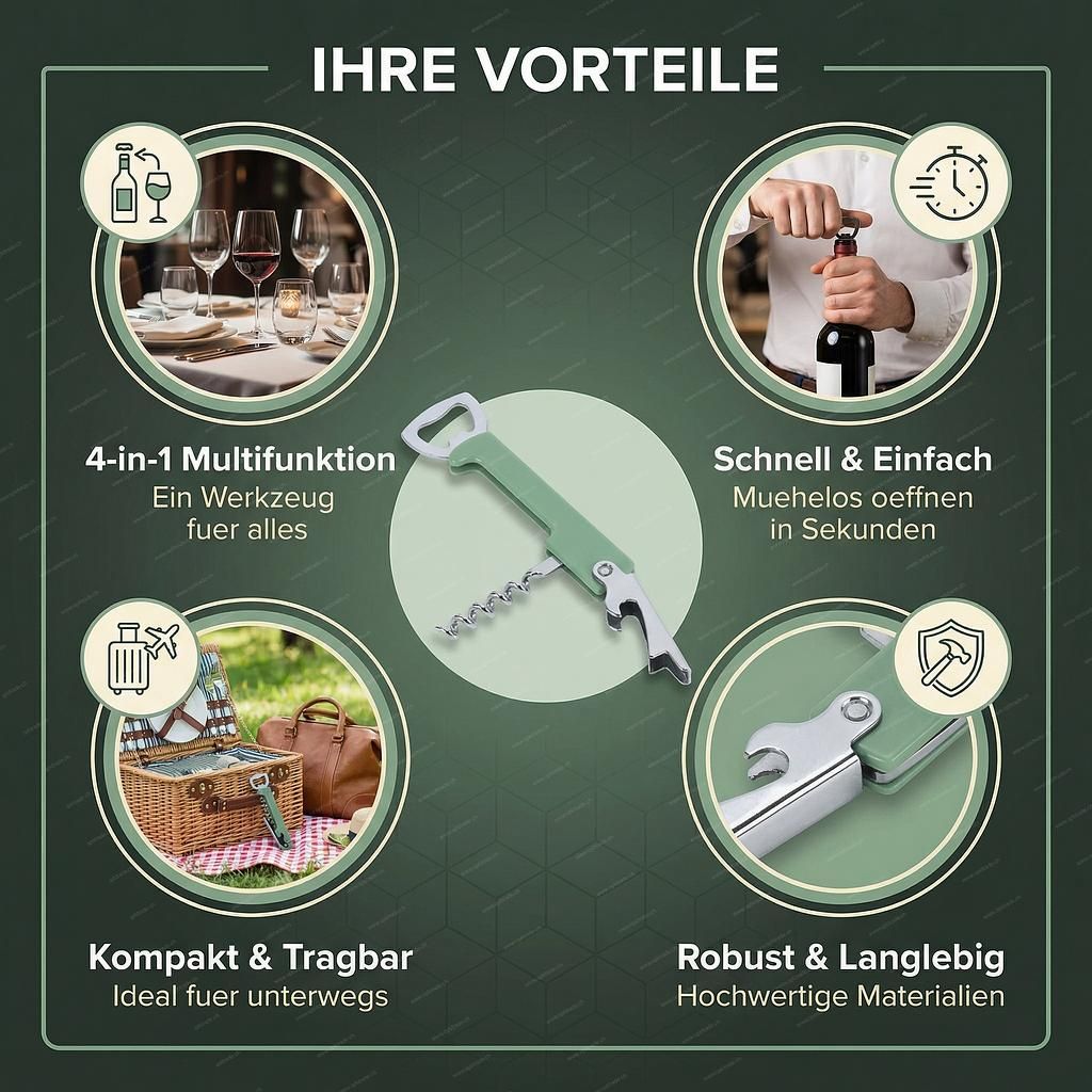 Multifunctional Corkscrew & Opener – 4-in-1 Helper This multifunctional kitchen tool is the indispensable helper for every occasion. Whether at a cozy dinner, a picnic, or at your home bar – this compact 4-in-1 opener solves any bottle-opening challenge in no time and saves you drawer space. Your advantage: Four functions in one. Forget countless individual tools. This clever bottle opener combines four essential functions in one robust design. It’s the perfect wine opener and bottle opener in one.