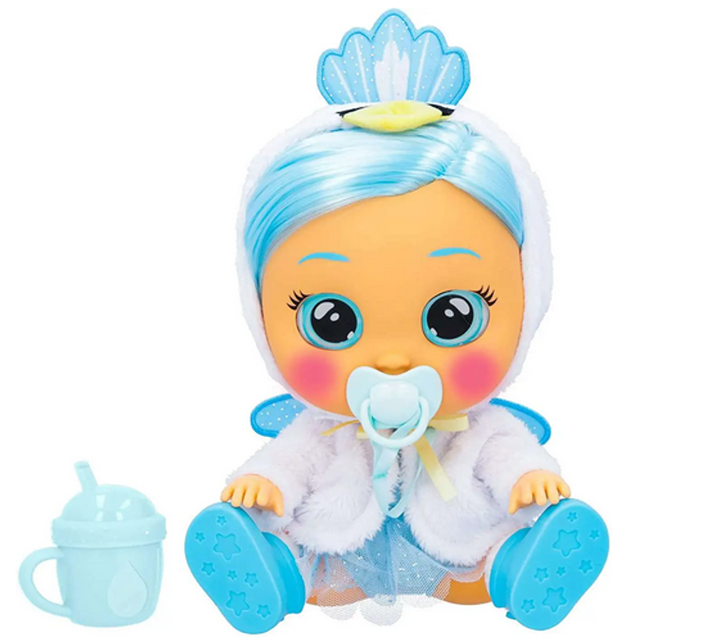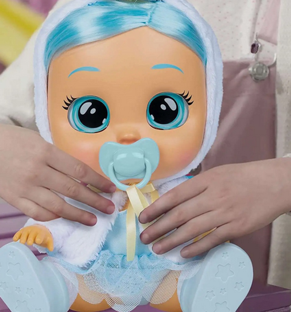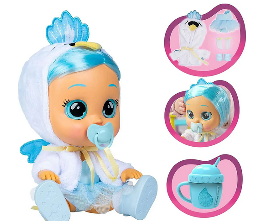Like all Cry Babies, Sydney cries real tears as soon as you take away her pacifier. She also makes over 15 realistic baby sounds, making the play experience authentic. To soothe her and make her smile, simply give her the included pacifier or baby bottle.