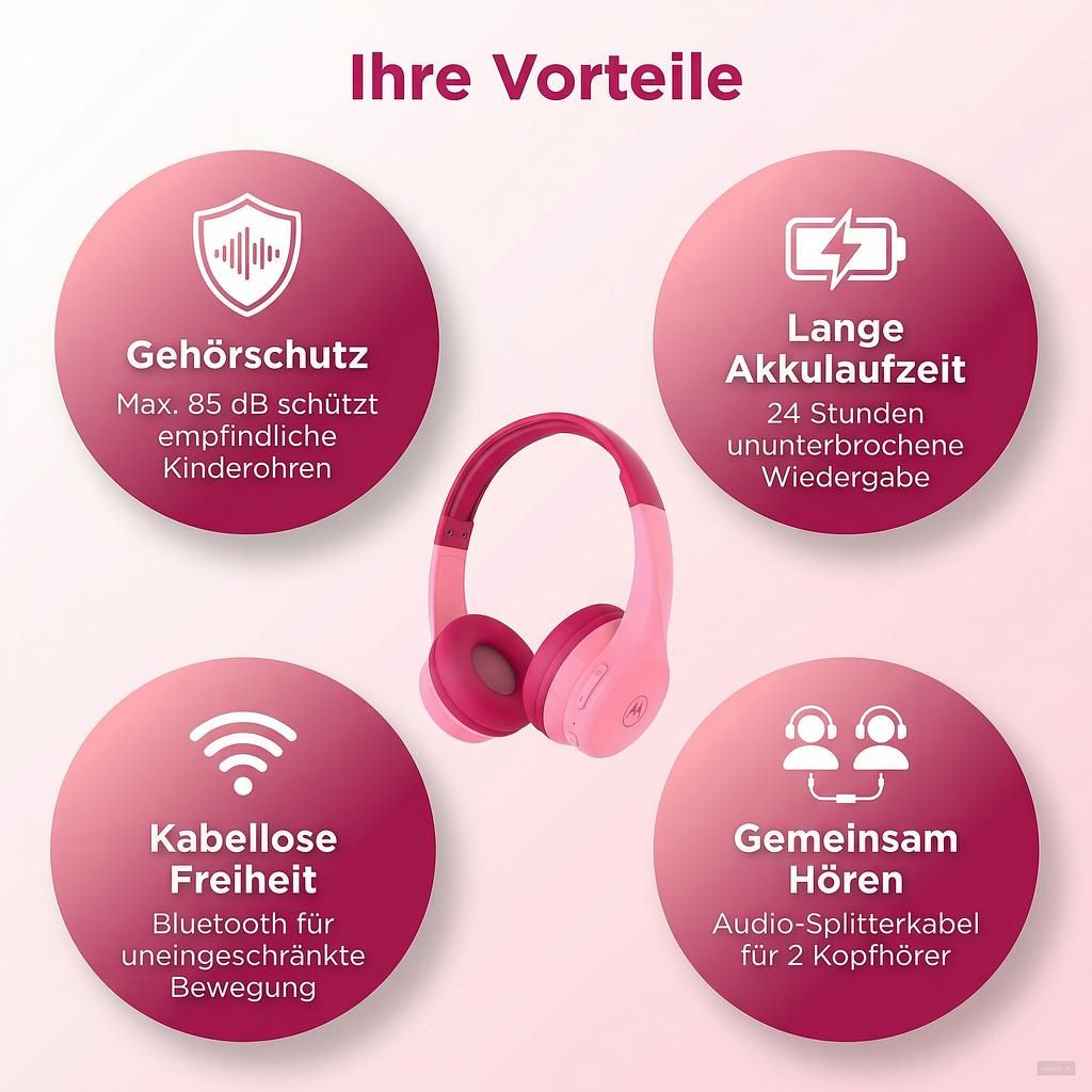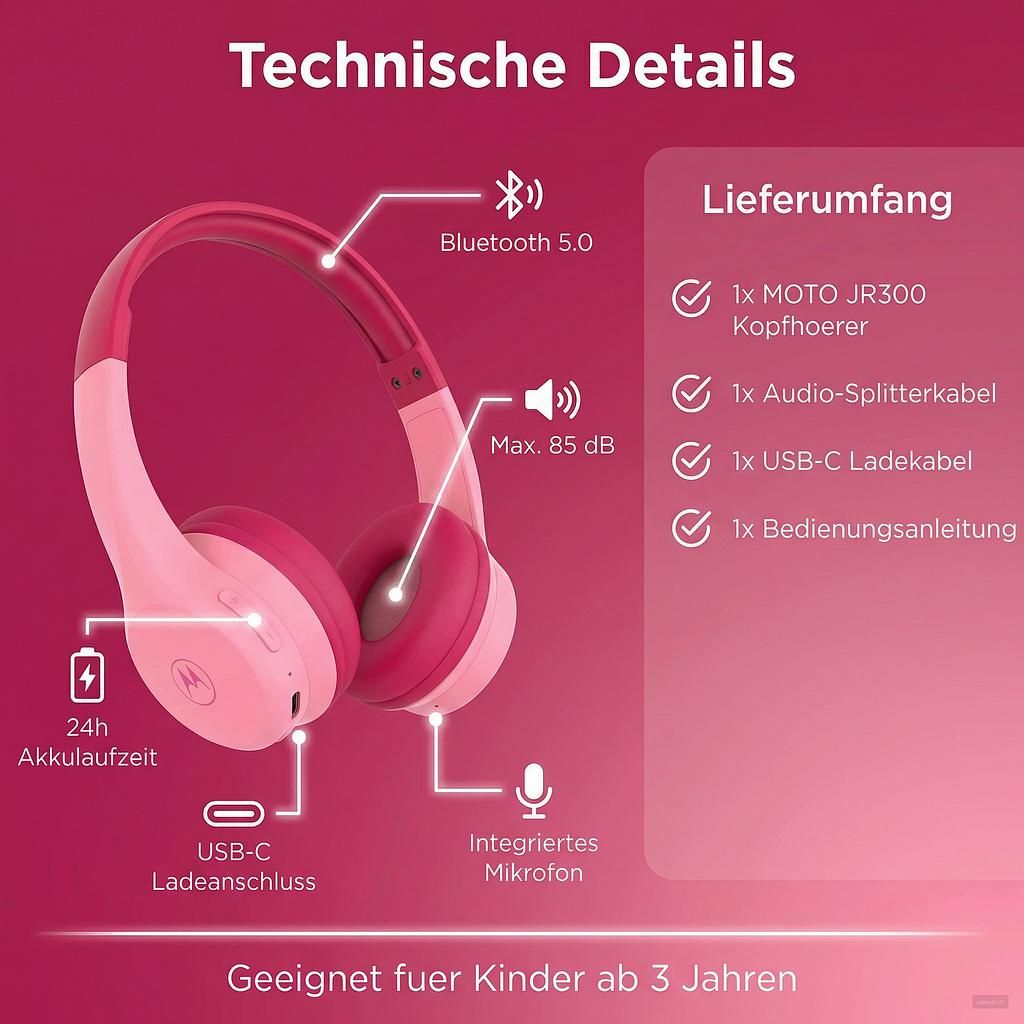 Get your child the MOTO JR300 Bluetooth Kids Headphones and give them a world full of music, audio plays, and learning content – safely, comfortably, and completely wirelessly. Order now and experience the difference!