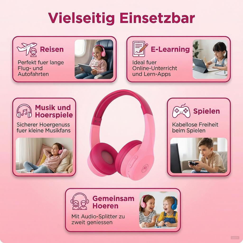 The headphones were specially designed for the anatomy of children. The headband is softly padded and infinitely adjustable, ensuring a comfortable and secure fit. The controls are intentionally intuitive: simple buttons allow children to adjust the volume or change tracks themselves. The integrated microphone also enables hands-free calls or participation in online lessons, making the MOTO JR300 a versatile device. A special highlight is the included audio splitter cable. This practical accessory allows two headphones to be connected to one audio source. This way, siblings or friends can listen to music together or watch the same movie – ideal for long car journeys. The MOTO JR300 is more than just a pair of headphones; It’s an experience.
