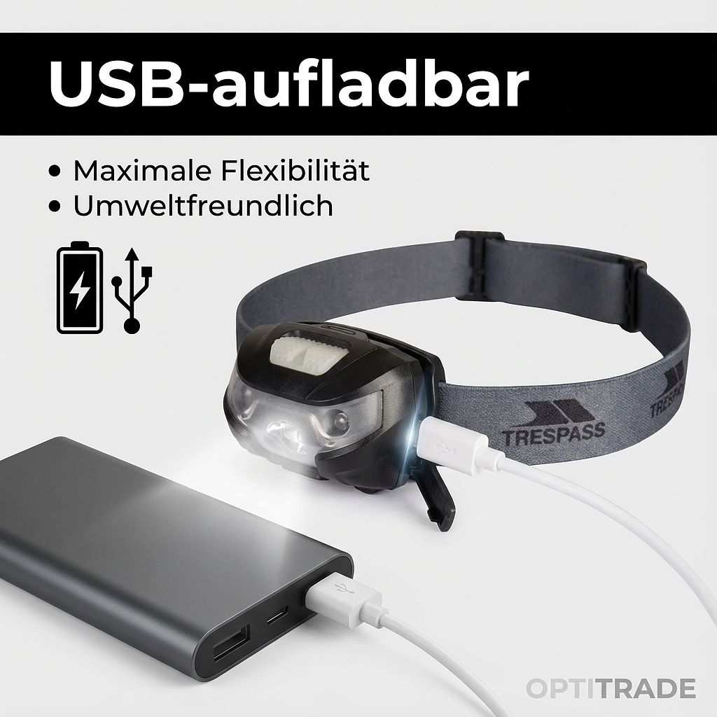 This modern USB Rechargeable Headlamp combines high brightness with long battery life. With an impressive 6-hour battery life per charge, you are perfectly equipped for extended tours or work assignments. Charging is conveniently done via any USB port, eliminating the need to constantly buy batteries.
