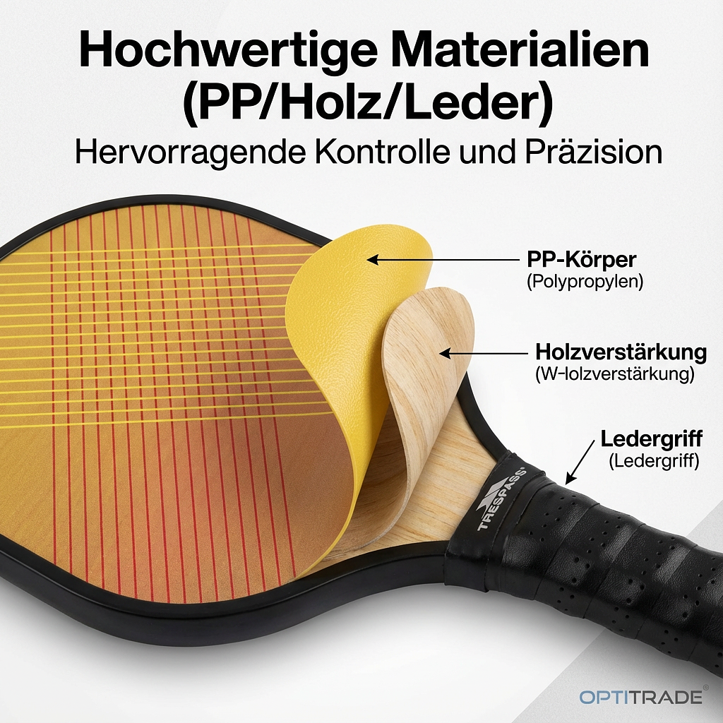 The Trespass MORTY Pickleball Set offers durable rackets made of PP, wood & leather, as well as sturdy PE balls for precise control and unlimited fun – perfect for everyone!