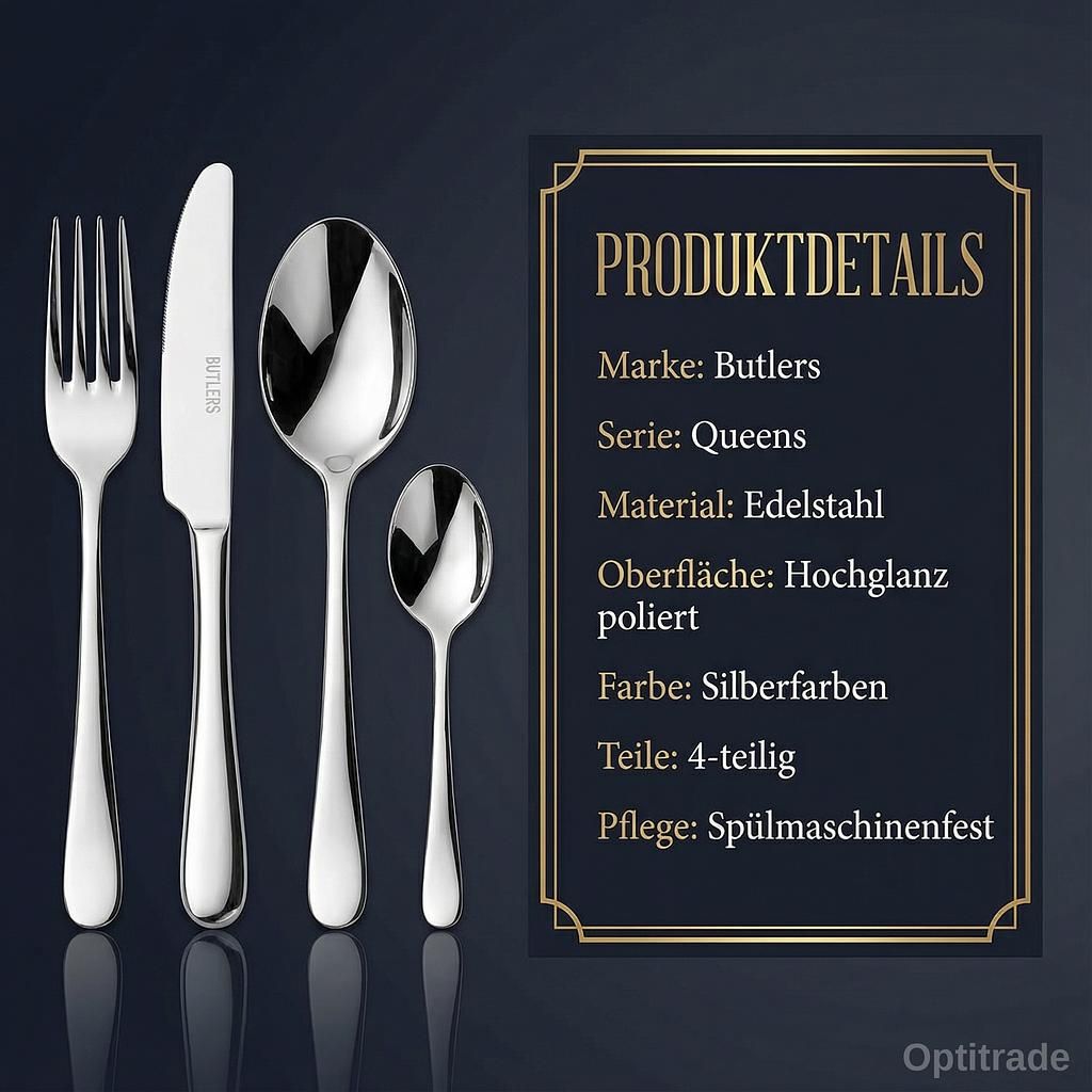 Le set de couverts Butler’s, composé de 4 pièces, impressionne par son acier inoxydable poli argenté et apporte une touche d’élégance à toutes les occasions – parfait pour les dîners chics et les tables de fête.
