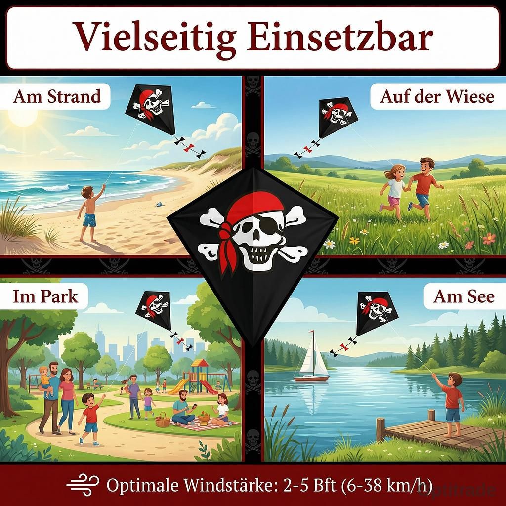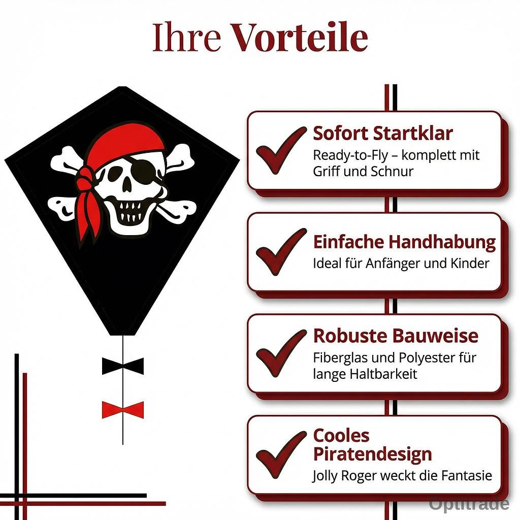 Le Jolly Roger d’Eddy est conçu pour une large plage de vent et vole de manière stable même par vent faible. C’est le cerf-volant monofil idéal pour une sortie en famille à la plage ou dans un pré. Force du vent : 2 à 5 Beaufort (6 à 38 km/h). Consignes de sécurité importantes : Ce cerf-volant est adapté aux enfants de 5 ans et plus. En raison du risque d’étranglement, il ne convient pas aux enfants de moins de 5 ans. S’agissant d’un jouet, la surveillance d’un adulte est fortement recommandée pendant son utilisation pour une sécurité optimale. Offrez à vos enfants une aventure aérienne sûre et palpitante avec le cerf-volant pirate HQ. Procurez-vous ce superbe cerf-volant pour enfants dès aujourd’hui et partagez la joie de faire voler un cerf-volant ensemble !