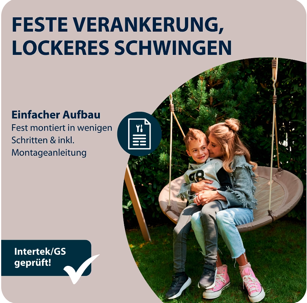 Cette toute nouvelle balançoire nid XXL ronde sera la pièce maîtresse de votre jardin ou de votre maison. Avec un diamètre généreux de 110 cm, cette grande balançoire pour enfants offre non seulement un confort optimal, mais aussi un design moderne qui ne manquera pas d’attirer tous les regards.