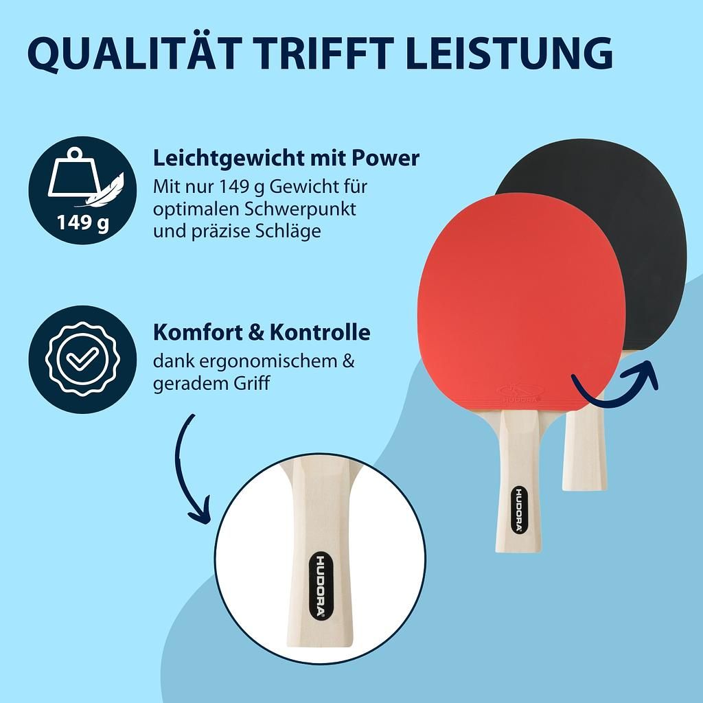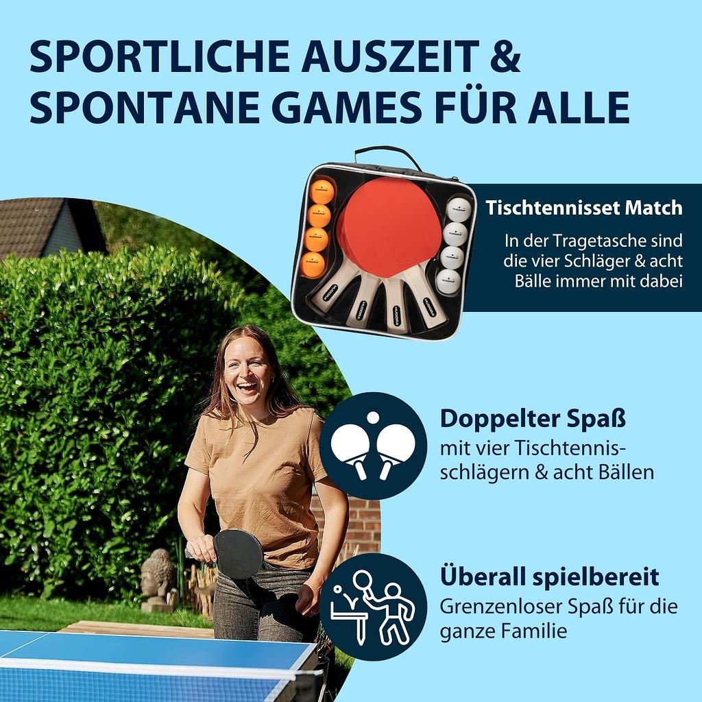 Cet ensemble de 4 raquettes de tennis de table comprend quatre raquettes spécialement conçues pour un style de jeu équilibré. Le placage en peuplier 5 plis et les picots inversés assurent un bon contrôle de la balle et une sensation de solidité. L’épaisseur de mousse de 1,5 mm est idéale pour les joueurs débutants et confirmés et garantit un bon effet et une bonne vitesse. Ergonomie et poids : chaque raquette est dotée d’un manche droit ergonomique qui assure une prise en main confortable et sûre. Avec un poids plume d’environ 149 g par raquette, le set de tennis de table Hudora est idéal pour des parties rapides et intenses, pour un plaisir prolongé. Accessoires de tennis de table complets : – 4 raquettes de haute qualité en bois plaqué 5 plis – 8 balles de qualité (4 blanches, 4 oranges) en ABS sans celluloïd – Mousse de 1,5 mm d’épaisseur pour un effet optimal – Manche droit et ergonomique pour une prise en main sûre – Poids par raquette : environ 149 g. Rangement et transport pratiques : Un sac de raquettes robuste avec compartiments pratiques est inclus. Il vous permet de ranger votre set et vos balles en toute sécurité et avec soin. Grâce à sa poignée de transport, le set est facile à emporter – idéal pour les vacances ou votre prochain pique-nique. Procurez-vous dès maintenant le set de tennis de table Friends de Hudora et vivez des moments inoubliables et conviviaux avec cet équipement sportif de haute qualité.