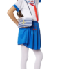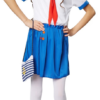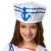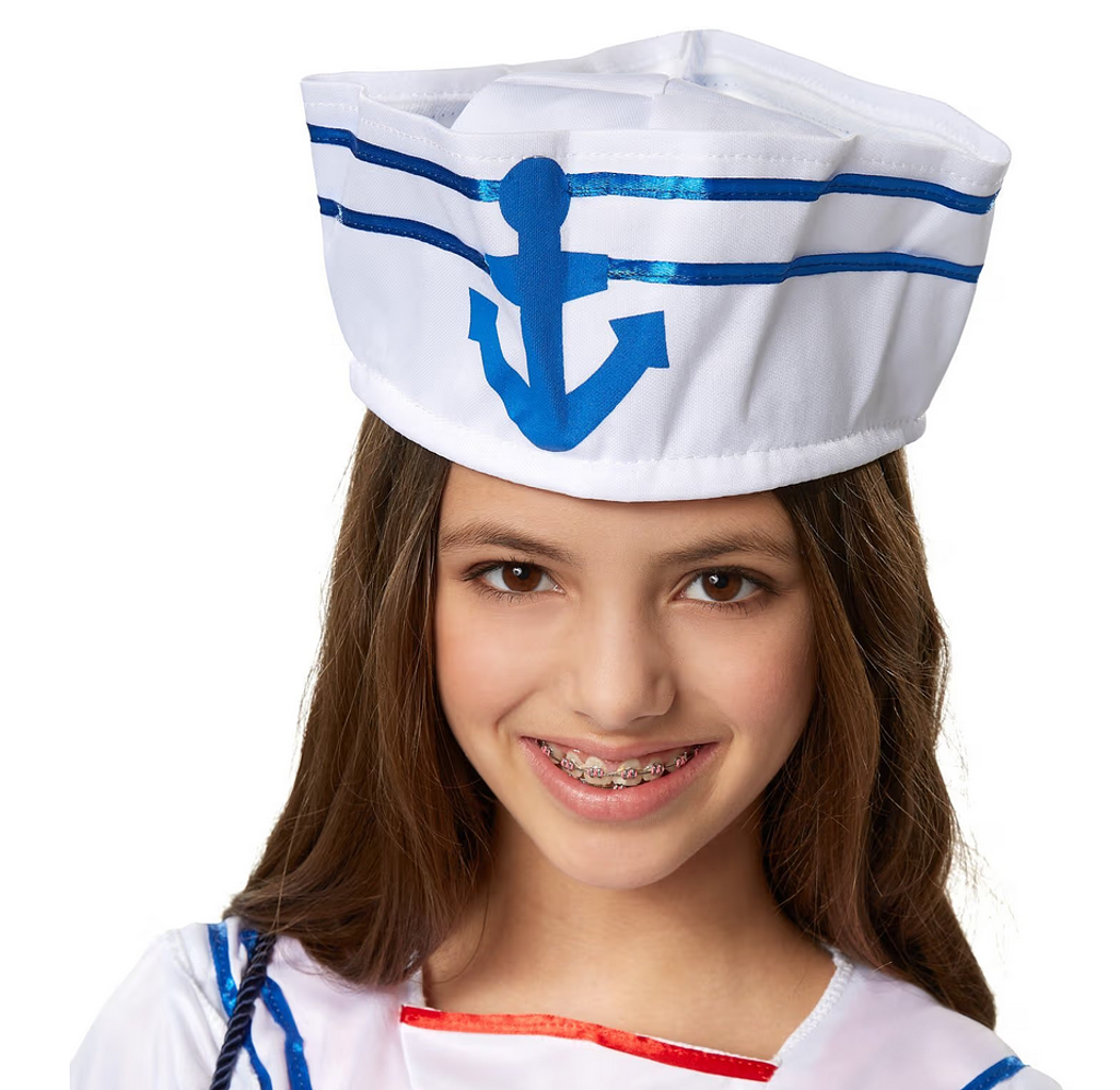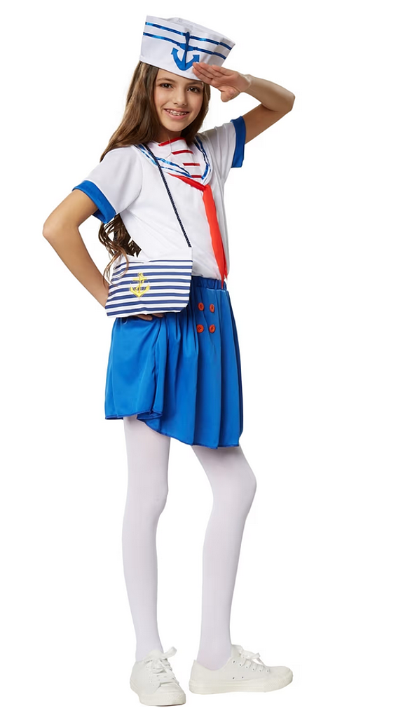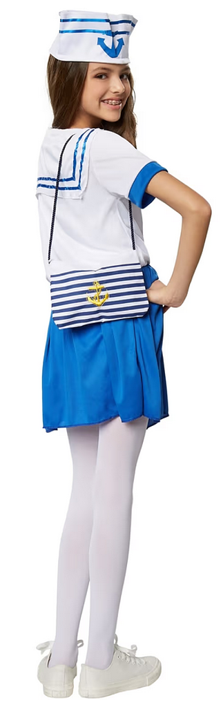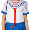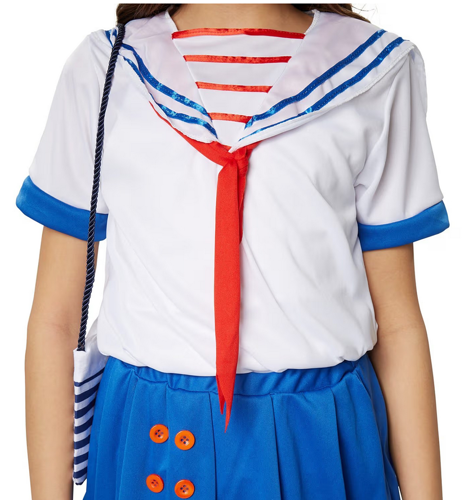 Das Kostüm besteht aus einem kurzärmeligen Oberteil mit typischem gestreiften Matrosenkragen und roten Bändern, die zu einer hübschen Schleife gebunden werden können. Der kurze Rock ist vorne mit vier dekorativen Knöpfen verziert und rundet das Outfit perfekt ab. Die passende Matrosenmütze mit Anker-Emblem sorgt für das authentische Finish und macht das Marine-Girl-Look komplett.