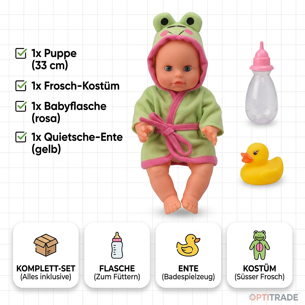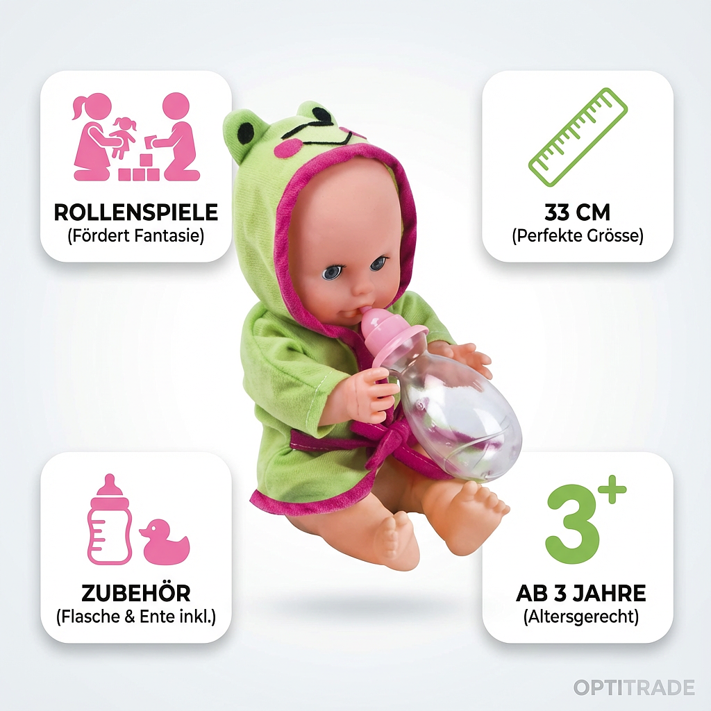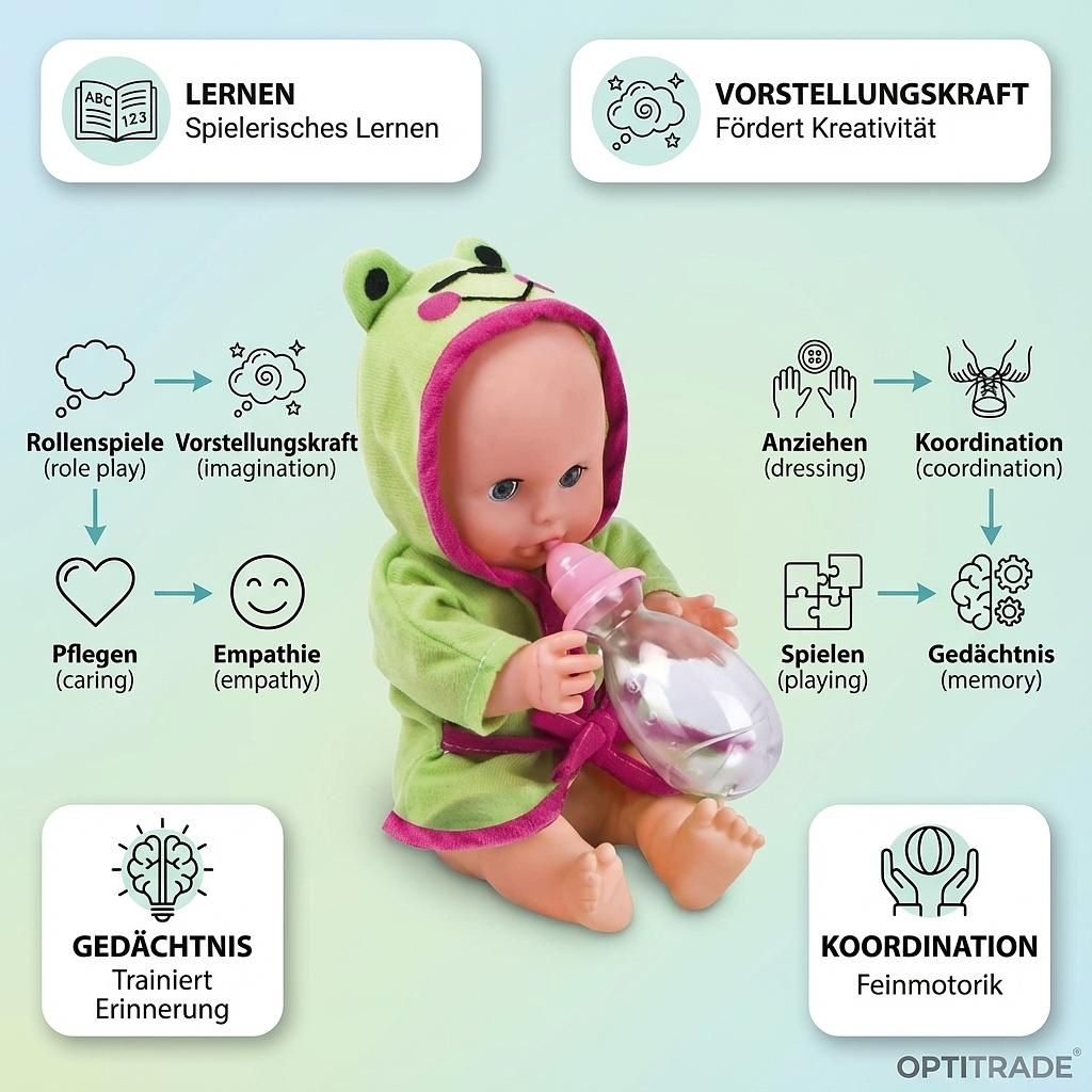 Giocare con la bambola contribuisce in modo significativo al miglioramento di diverse competenze chiave. Il gioco interattivo è particolarmente utile per lo sviluppo della memoria e delle capacità di coordinazione. Il bambino impara ad assumersi responsabilità e a sviluppare empatia in modo naturale. Design e dimensioni: con i suoi circa 33 cm, questa bambola è perfetta per le manine dei bambini. È leggera e maneggevole, quindi può essere portata ovunque, sia per giocare nella cameretta dei bambini che come fedele compagna di viaggio. La lavorazione è studiata appositamente per le esigenze dei più piccoli, per garantire durata e sicurezza.