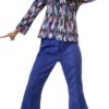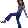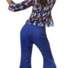 Il costume da Disco Queen da donna è composto da due pezzi. I pantaloni hanno una gamba ampia e svasata e si chiudono con un bottone e una cerniera. La cintura ha inserti elastici e passanti per cintura. C’è una piega sul davanti di ogni gamba. È inclusa una camicetta a maniche lunghe con fantasia multicolore abbinata, bottoni e colletto; il materiale è 100% poliestere.