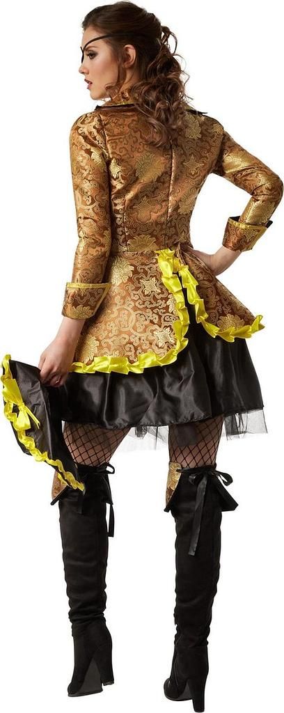 Il costume colpisce per i delicati motivi sulla giacca che sottolineano perfettamente il tuo ruolo di elegante bucaniere. Il cappello con la sua fascia gialla e il fiocco aggiunge un tocco di eleganza, mentre i copristivali coordinati conferiscono al tuo outfit un autentico look da pirata. La benda sull’occhio completa il tuo look: misterioso, affascinante e sicuro di sé.