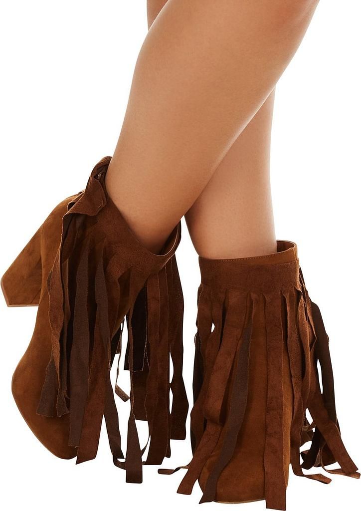 La fascia coordinata completa perfettamente l’outfit e sottolinea il tuo stile hippie personale, che tu porti i capelli sciolti, ondulati o intrecciati. I copristivali con frange, anch’essi in effetto scamosciato, sono un altro dettaglio che completa il tuo look.