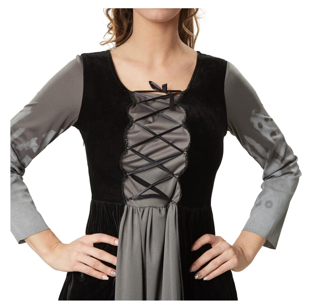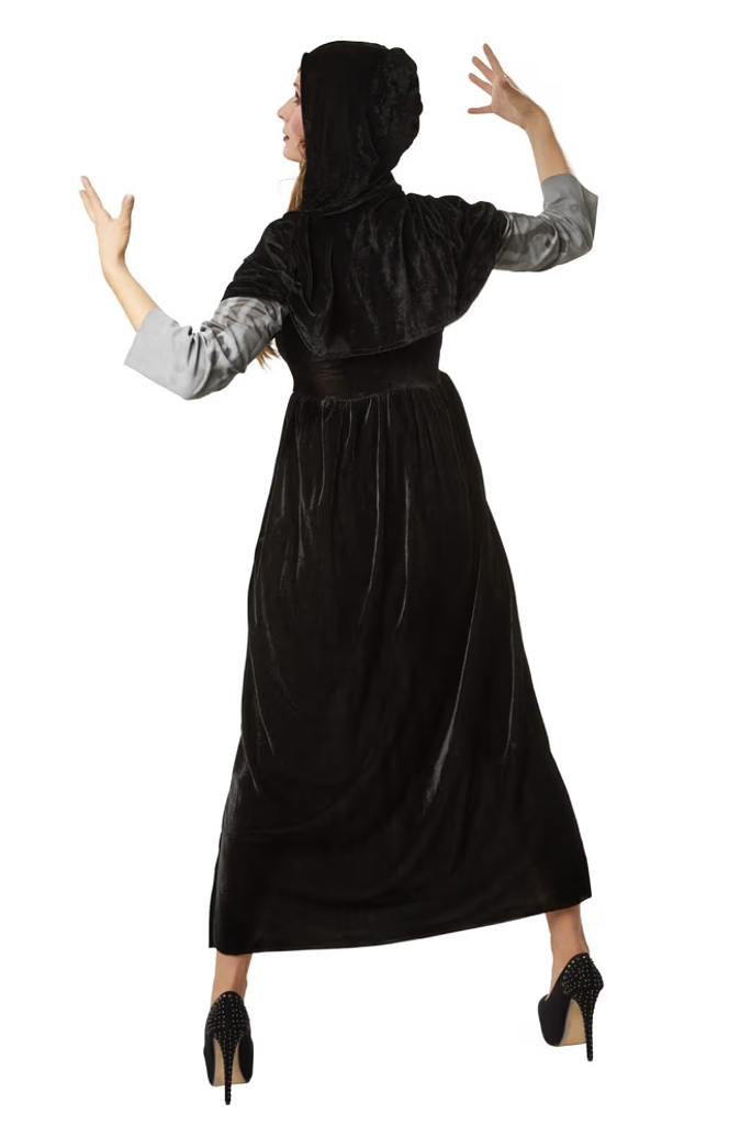 Un dettaglio speciale sono i volti di fantasma bianchi che decorano la parte inferiore della gonna e le maniche. Conferiscono all’abito un tocco misterioso e leggermente dark, perfetto per qualsiasi potente strega, strega o mago.