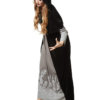 Un pannello grigio si estende dalla scollatura all’orlo e lungo le maniche: un elegante contrasto che sottolinea l’aspetto mistico della strega.