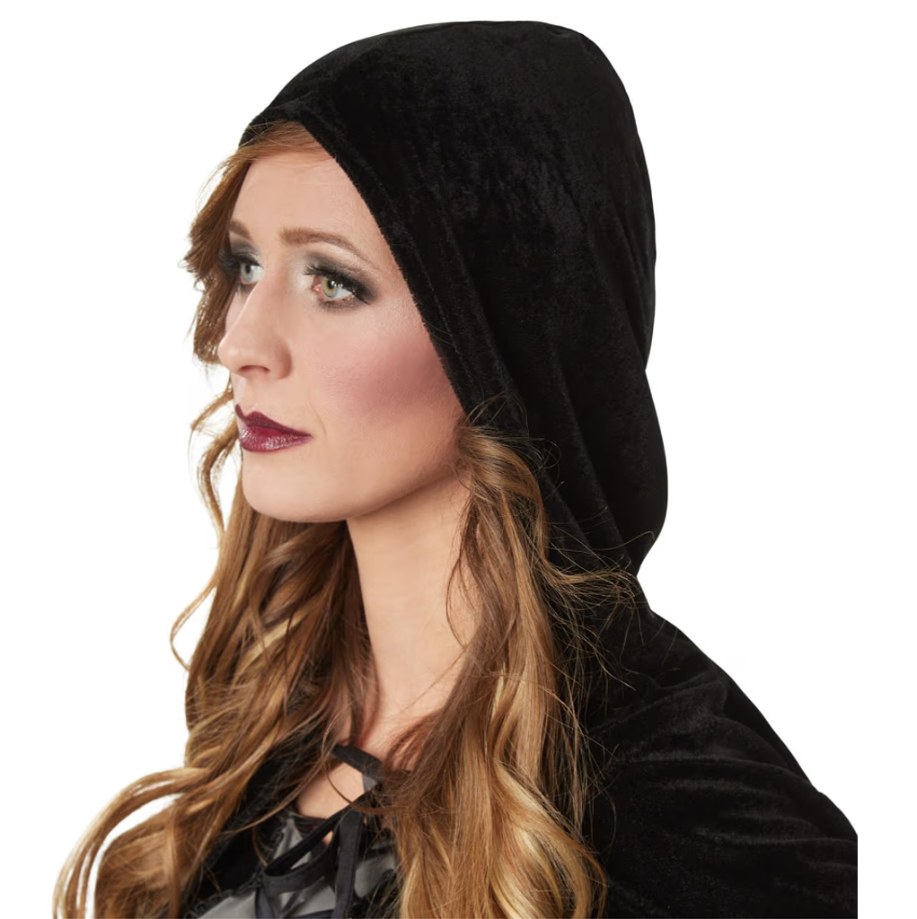 Il completo è completato dal corto mantello di velluto con cappuccio, che può essere elegantemente allacciato sul davanti e completa il look mistico.
