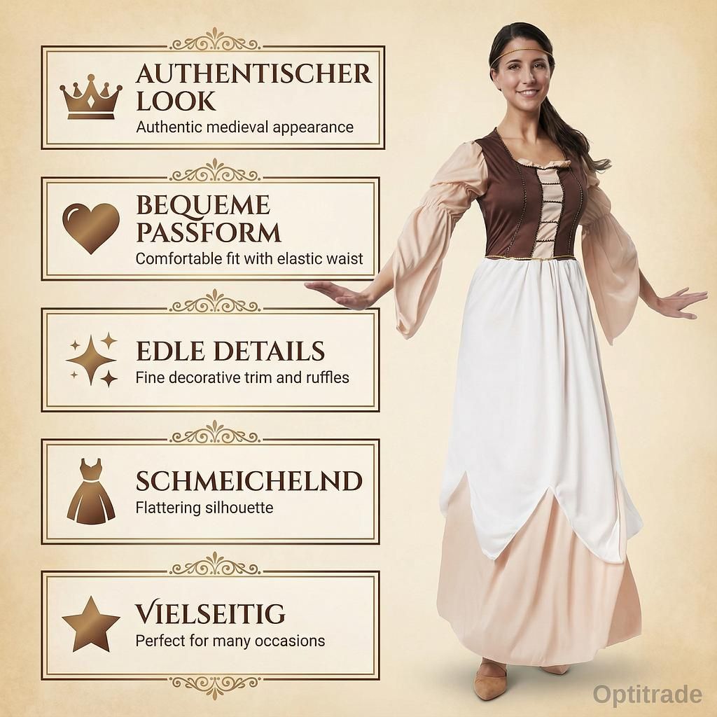 Immergiti nel mondo di epoche passate! Con il costume da donna “Bellezza Medievale”, diventerai un’incantevole dama d’altri tempi: aggraziata, misteriosa ed elegante allo stesso tempo. Questo splendido abito medievale affascina con i suoi colori caldi, la meticolosa lavorazione artigianale e l’autentico look storico.