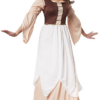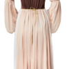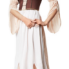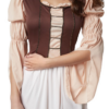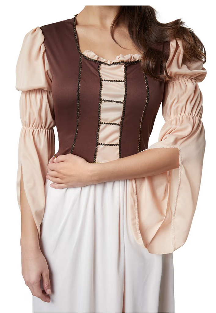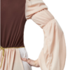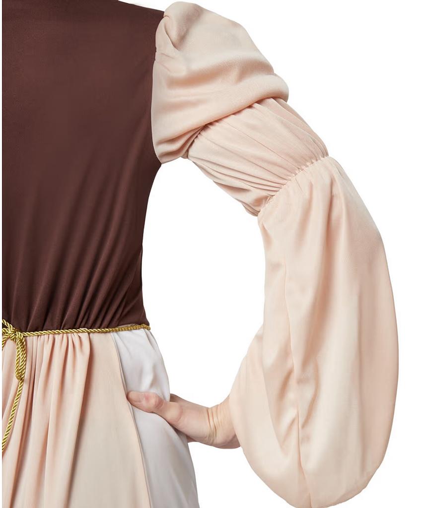 L’abito lungo fino alla caviglia, in una delicata tonalità nude, è perfettamente completato da un corpetto marrone scuro con corsetto e inserto beige. La scollatura è impreziosita da delicate balze beige ed eleganti rifiniture nere e dorate, che conferiscono al costume un carattere raffinato e femminile. Le ampie maniche cucite asimmetricamente con polsini elasticizzati ai gomiti sono particolarmente accattivanti: garantiscono libertà di movimento e un autentico look medievale.