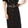 Vestito per un divertente costume da donna “Sexy Policewoman”: abito nero attillato, cintura in pelle e manette per un look da festa seducente e versatile.