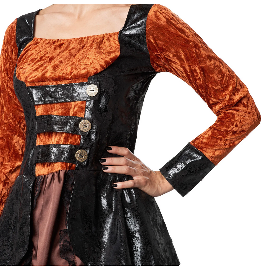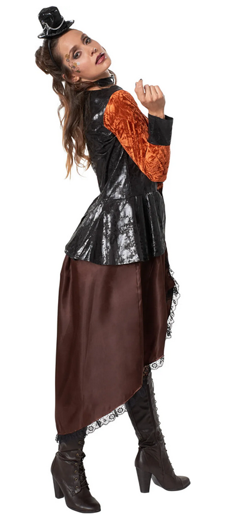 Abbina questo completo ad accessori steampunk come occhiali, gioielli, guanti di pizzo o stivali stringati per perfezionare il tuo look. Completa il tuo look elegante con un trucco nei toni del rame, dell’oro o del bronzo.