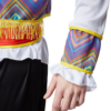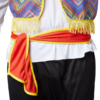 La camicetta bianca presenta uno scollo a V leggermente accentuato che crea una silhouette maschile. Le maniche lunghe terminano con ampie applicazioni colorate sui polsi, aggiungendo un vivace tocco di colore. Questa combinazione di camicetta, gilet e cintura fornisce un’eccellente base per il tuo outfit messicano.
