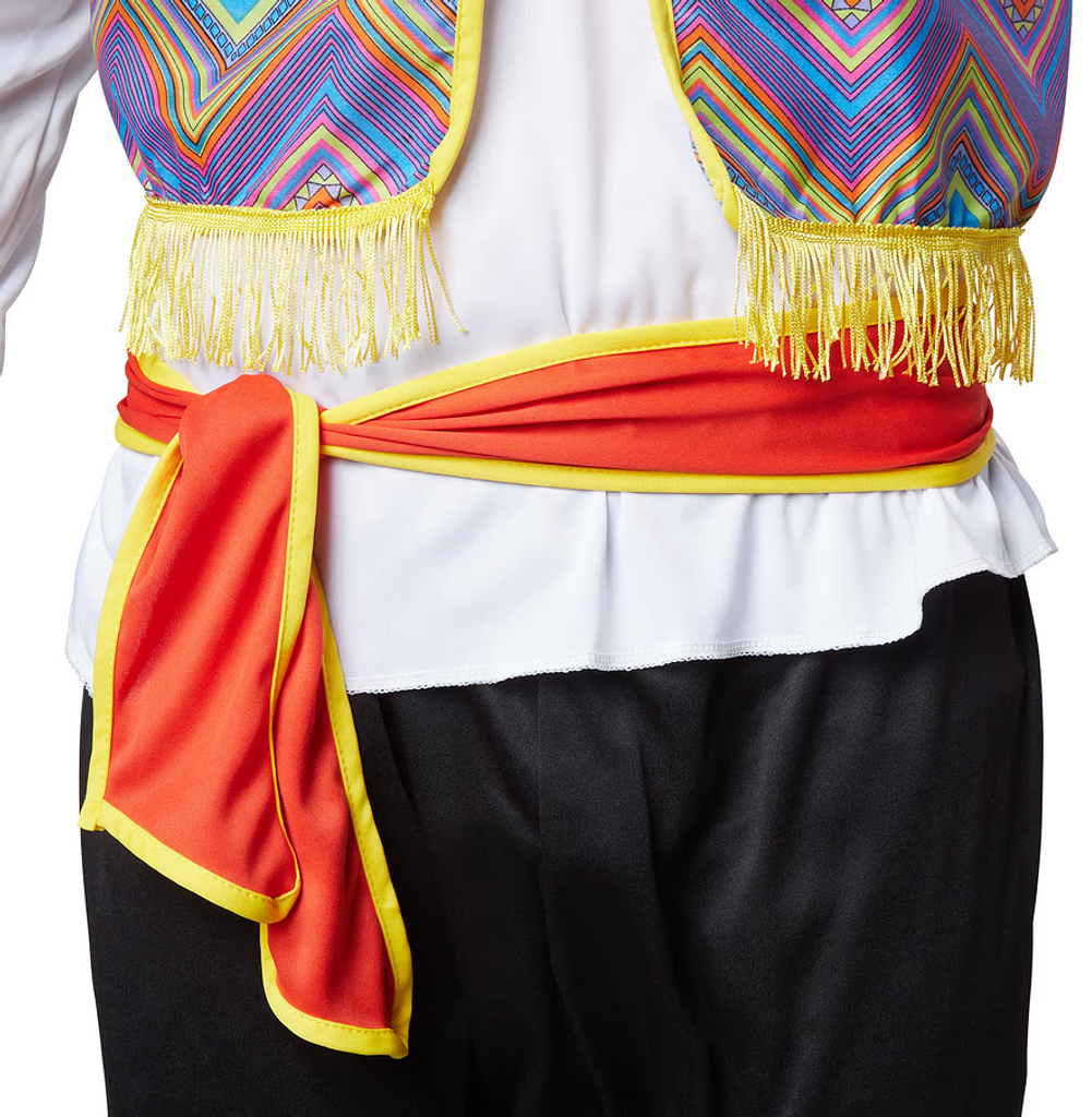 Il gilet senza maniche è il pezzo forte dell’outfit. Presenta un motivo tradizionale che ricorda immediatamente il Messico. L’opzione di allacciatura è particolarmente pratica, consentendo una vestibilità personalizzata: un vero gilet tradizionale allacciato in stile messicano. Un colletto cucito con finiture e pompon, insieme a un bordo decorativo con frange lungo la cucitura anteriore, completano il look autentico. Punti salienti del focoso señor: – Abito messicano in colori vivaci e un design tradizionale – Camicetta con scollo a V leggermente rialzato per un look accattivante – Ampi polsini ai polsi per un accento colorato – Gilet con lacci in un motivo tradizionale per una vestibilità ottimale – Cintura rossa con una finitura gialla come accessorio di stile. Materiale e cura: L’intero completo è realizzato in 100% poliestere, garantendo resistenza e facilità di manutenzione. Puoi contare sul tuo costume messicano da uomo per mantenere la sua forma anche dopo vivaci festeggiamenti. Incluso nella confezione: – Camicetta – Giacca in vita (gilet) – Cintura da annodare Assicurati subito questo impressionante costume messicano da uomo e porta il temperamento focoso e la gioia di vivere latinoamericana al tuo prossimo evento. Arriba, arriba!