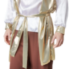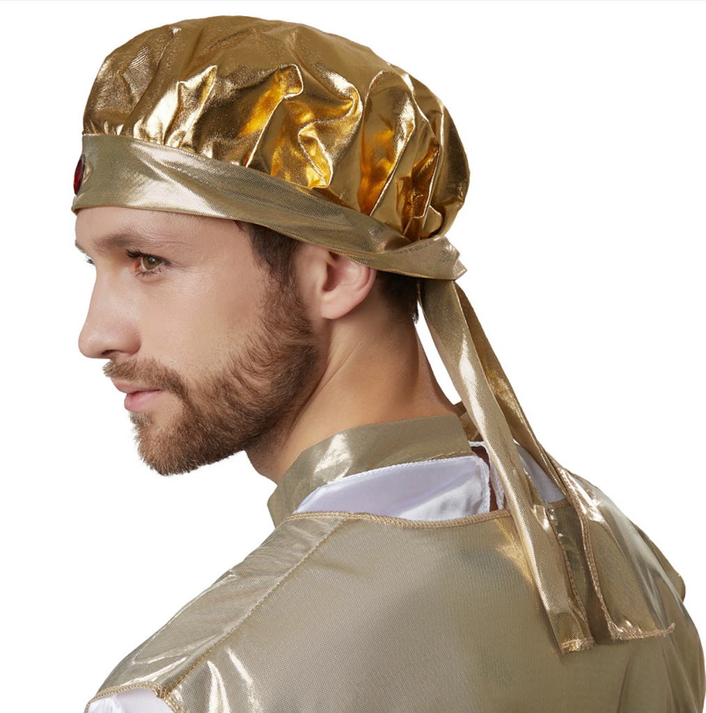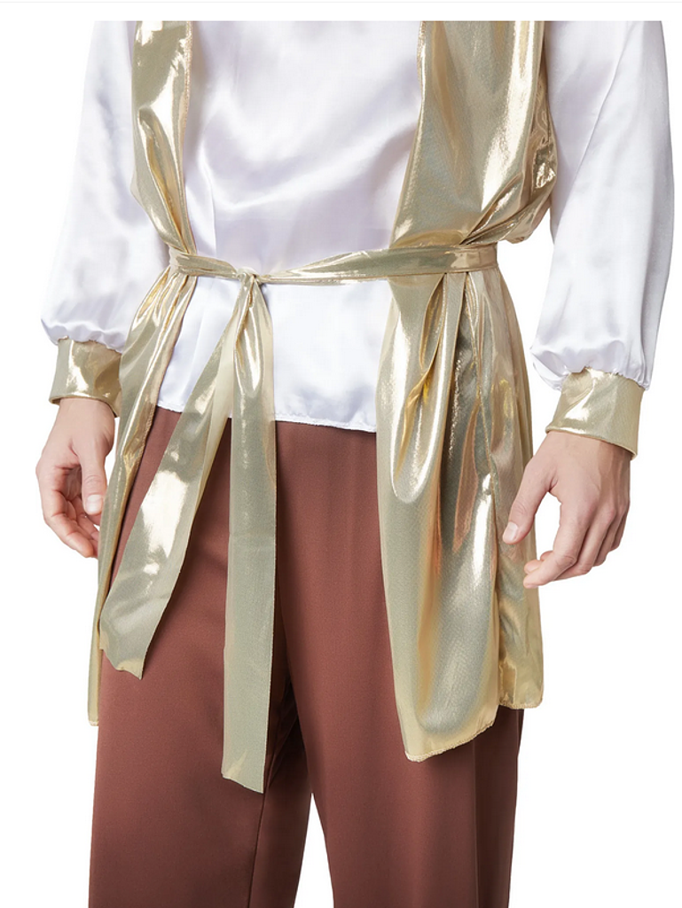 Sopra la camicia, si indossa la tunica senza maniche, la cui forma e la lussuosa fascia con applicazioni dorate completano il look maestoso. Un vero punto forte è il copricapo decorato, che ti fa sembrare un vero sultano. I copriscarpe coordinati a forma di becco completano l’outfit e rendono il look perfetto.