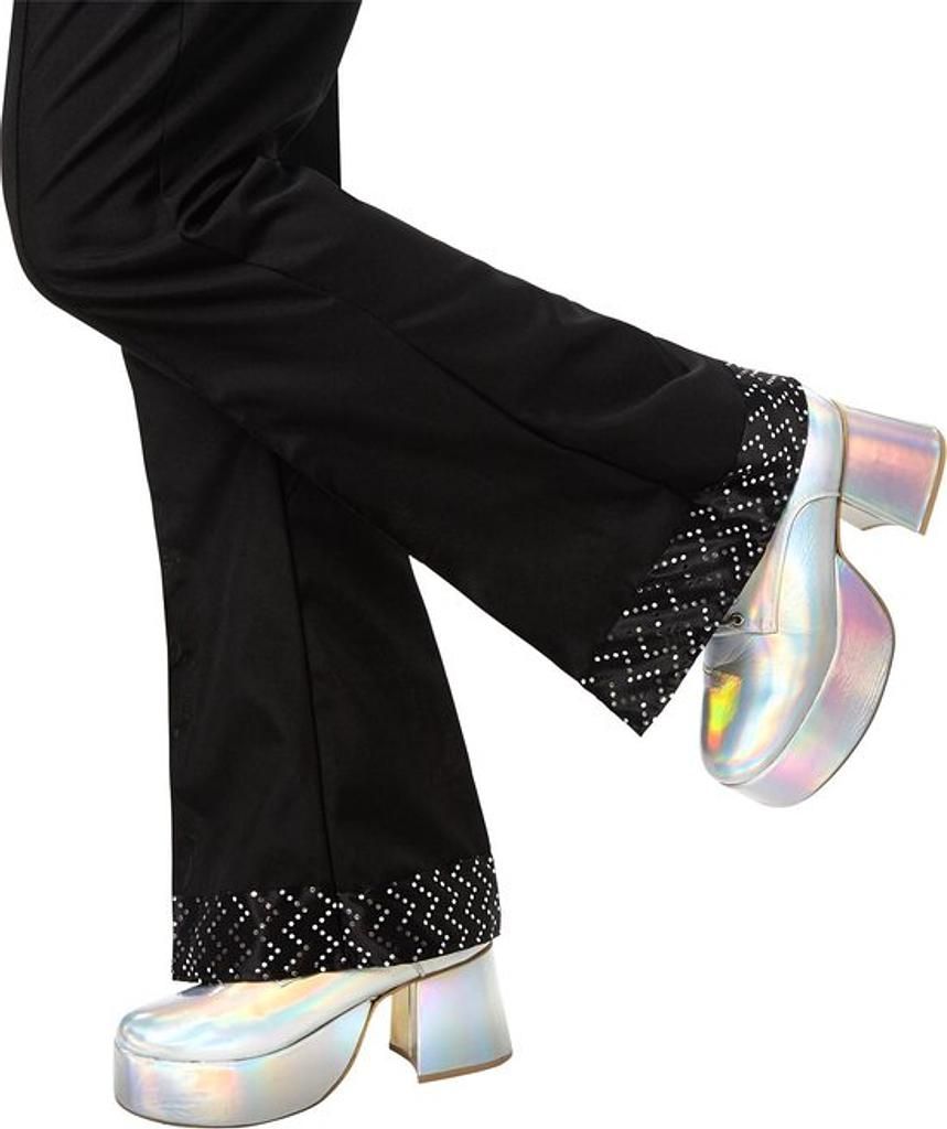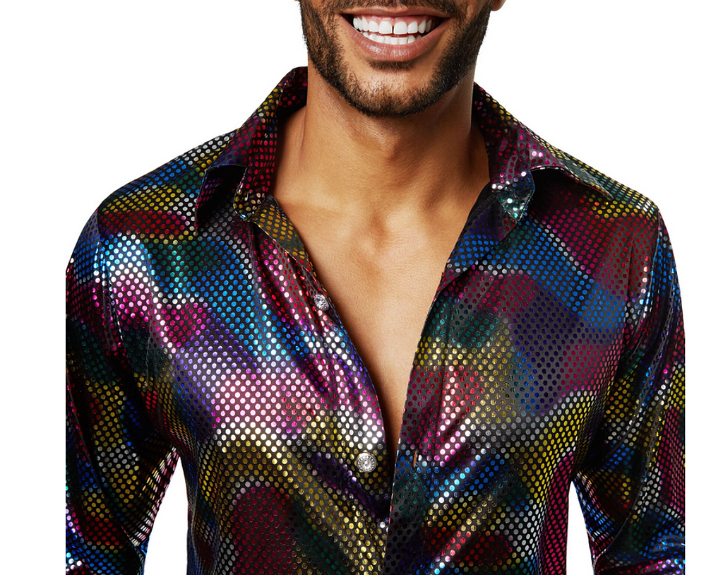 Il costume da Disco King da uomo è composto da pantaloni lunghi con piega stirata e polsini ampi, bottone, cerniera, elastico in vita e passanti per cintura. La vita ampia è decorata con un motivo a pois lucidi. La camicia a maniche lunghe con bottoni ha un colletto e un motivo a pois lucidi color arcobaleno. Materiale: 100% poliestere.
