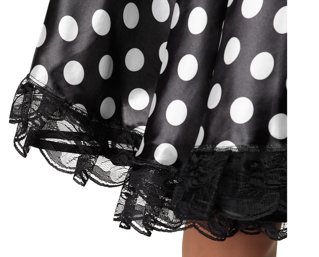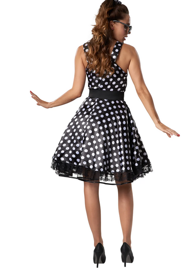 Il costume è composto da un grazioso abito senza spalline dal taglio aderente e da una gonna ampia e fluida che cattura perfettamente la classica silhouette dell’era del rock ‘n’ roll. Il bordo in pizzo sulla gonna corta aggiunge un tocco elegante, mentre il materiale leggero garantisce comfort e ampia libertà di movimento: ideale per ballare e festeggiare.