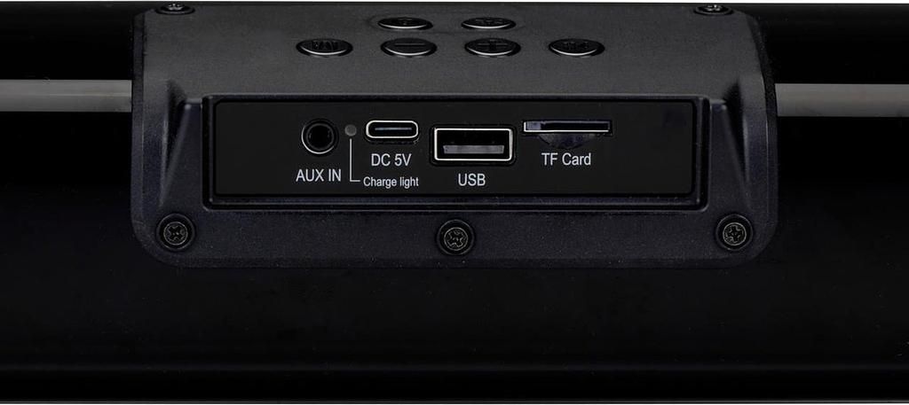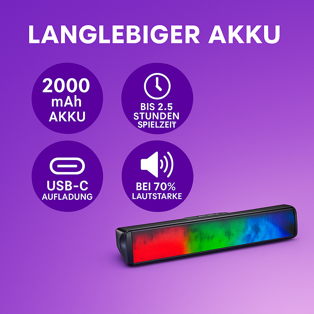 Ascolta la tua musica con la migliore qualità grazie all’uscita altoparlanti da 2 x 5 W. La moderna Soundbar TV Bluetooth utilizza il Bluetooth 5.3 per una connessione stabile e wireless con una portata fino a 10 metri. Oltre al Bluetooth, sono disponibili opzioni di connettività flessibili come USB, AUX e SD (TF), rendendo il dispositivo ideale per l’uso come soundbar Bluetooth per TV o con un PC. Affascinante effetto fiamma a LED: il punto forte assoluto è la soundbar integrata con effetto fiamma. Con 16 LED e 8 modalità colore selezionabili – dall’arancione caldo al blu, verde, rosso e multicolore – puoi creare l’atmosfera perfetta in pochissimo tempo. Questo altoparlante a fiamma LED rende ogni festa o serata accogliente un’esperienza speciale. Portatile e di lunga durata: come altoparlante Bluetooth portatile, questo modello offre la massima flessibilità. La batteria integrata da 2000 mAh offre fino a 2,5 ore di riproduzione (al 70% del volume) e può essere comodamente ricaricata tramite USB-C. Porta l’altoparlante con te ovunque e goditi un suono e un design luminoso straordinari ovunque tu sia.
