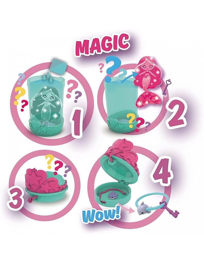 Ognuna delle Bambole Magiche è contenuta in una capsula, che contiene più della semplice bambola. Apri la custodia con la chiave e scopri un’entusiasmante sorpresa: un braccialetto con un ciondolo a forma di creatura marina che potrai indossare con orgoglio!