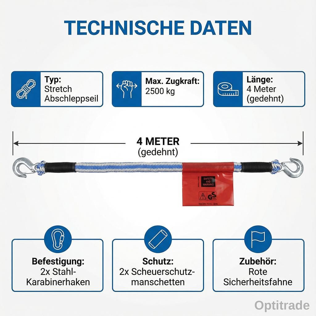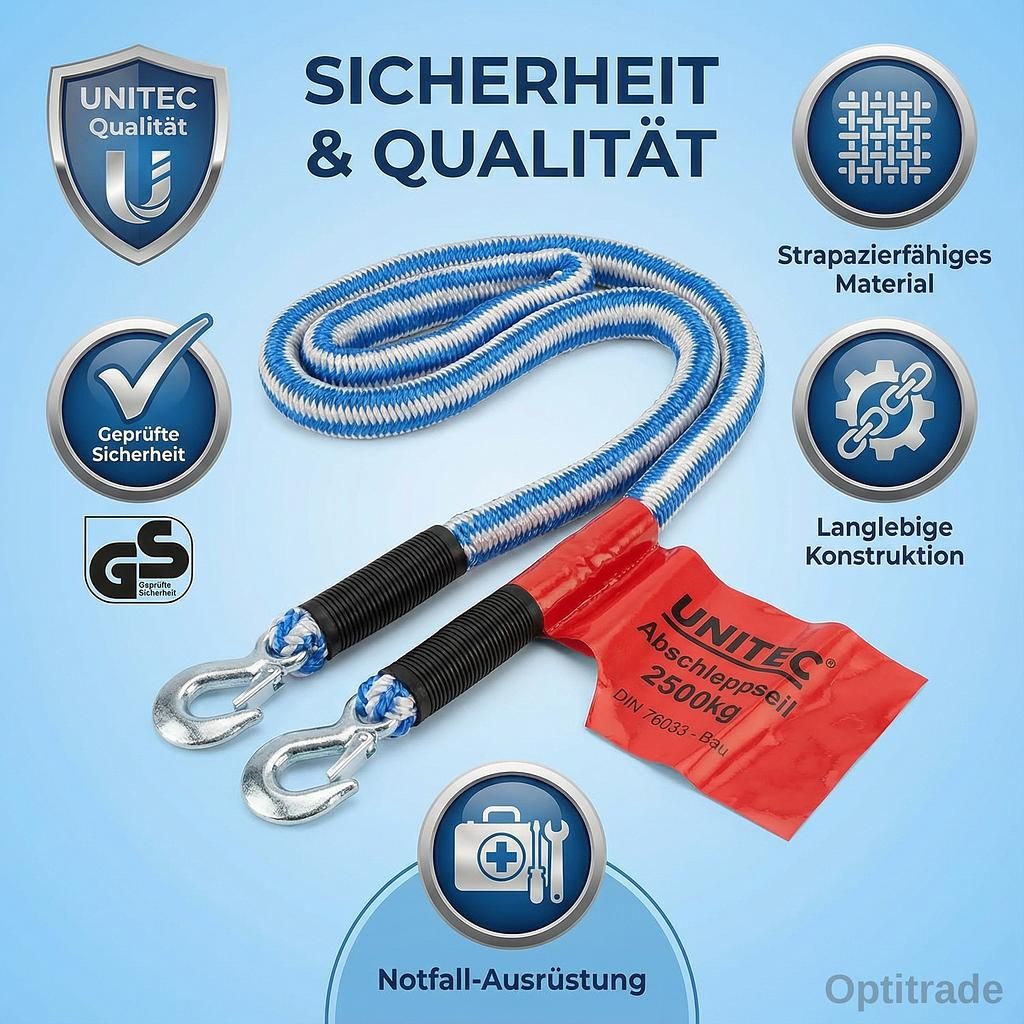 Se il tuo veicolo si guasta improvvisamente, la fune di traino Unitec 2500 kg è il tuo aiuto affidabile. Questa fune di traino elastica altamente elastica è stata sviluppata appositamente per un traino sicuro e fluido ed è indispensabile in ogni situazione di emergenza.