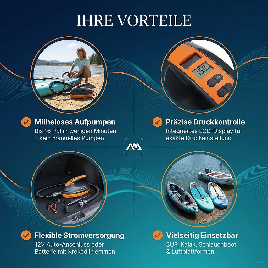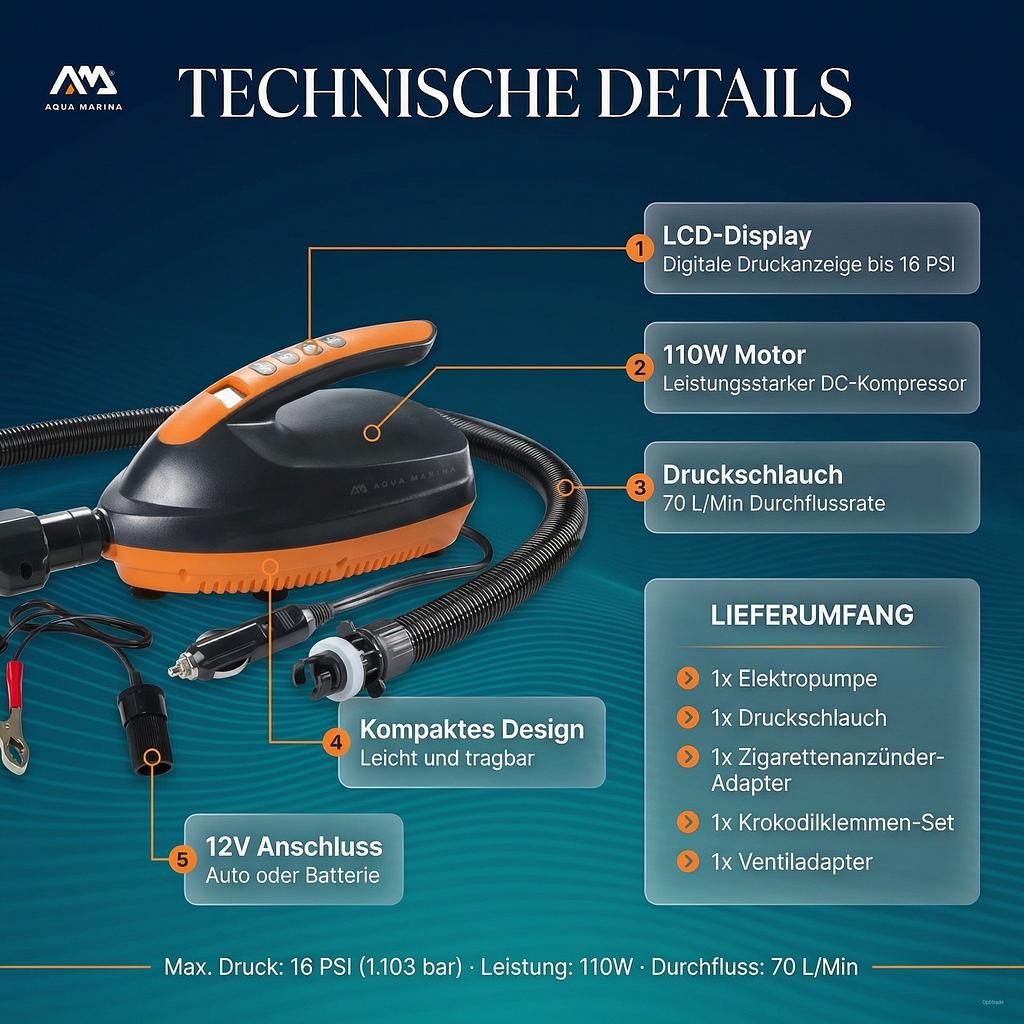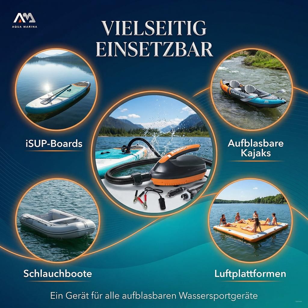 Vergessen Sie mühsames manuelles Pumpen! Die Aqua Marina Elektropumpe revolutioniert das Aufpumpen Ihrer aufblasbaren Wassersportgeräte. Diese leistungsstarke elektrische SUP Pumpe 12V ist das unverzichtbare Zubehör, das Ihnen mehr Zeit auf dem Wasser und weniger Zeit beim Vorbereiten schenkt.