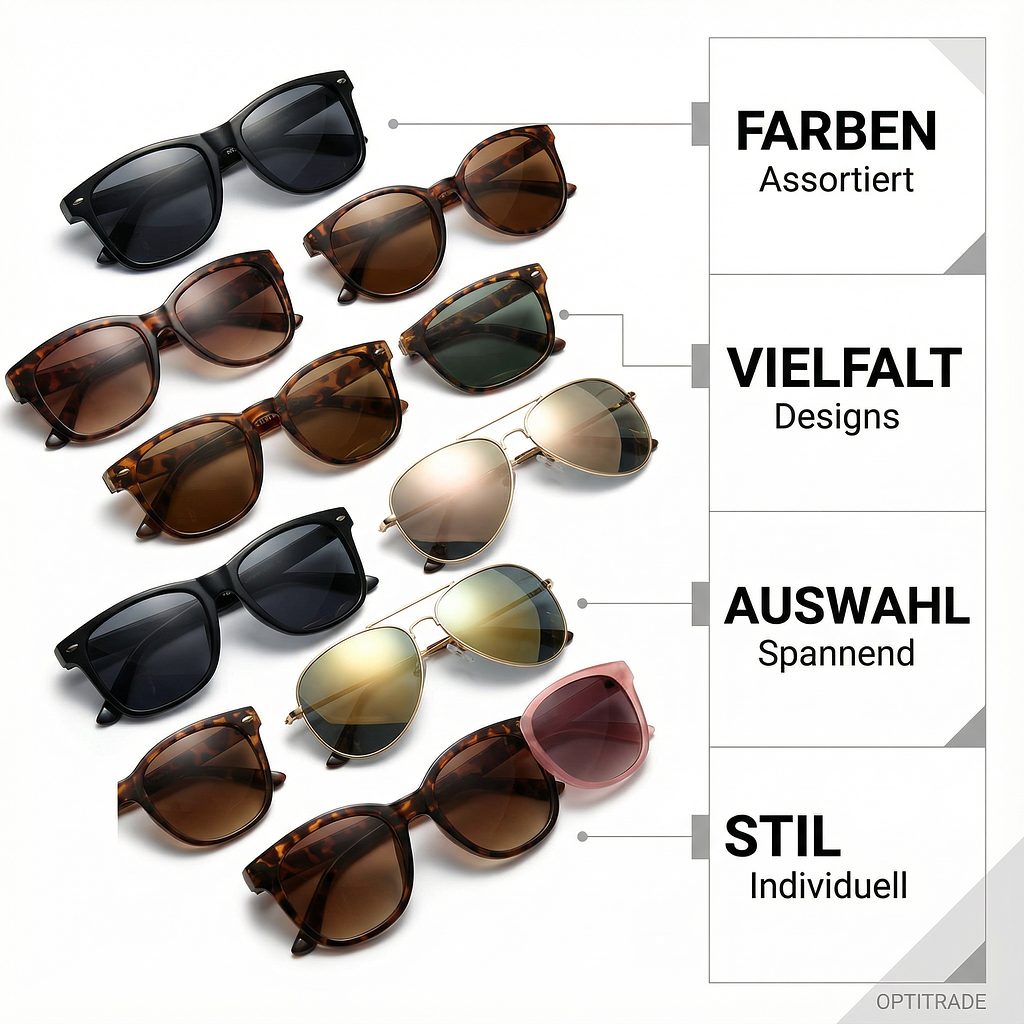 Wählen Sie aus einer Vielfalt an modischen Sonnenbrillen, die sowohl als Damen Sonnenbrille als auch als Herren Sonnenbrille geeignet sind. Die Brillen werden assortiert versendet, um Ihnen eine spannende Auswahl zu bieten. Wir versuchen, auf Farbwünsche Rücksicht zu nehmen, können dies jedoch nicht garantieren.