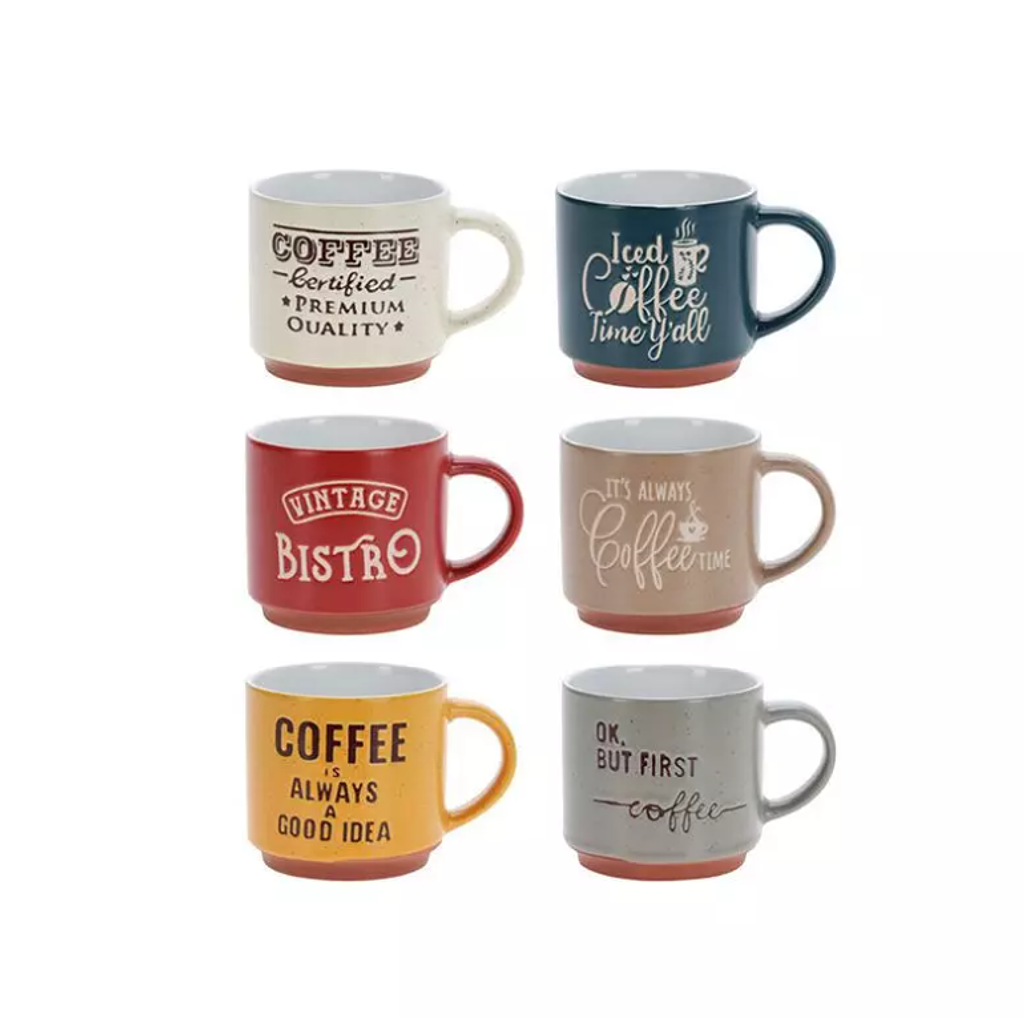Dieses charmante Set besteht aus langlebigem, massivem Steingut, das für seine Haptik und Wärmespeicherung geschätzt wird. Das Kaffeetassen Set 6 umfasst sechs Becher, die jeweils mit einem einzigartigen, warmfarbigen Kaffeemotiv verziert sind – ideal, um Abwechslung auf Ihren Tisch zu bringen.
