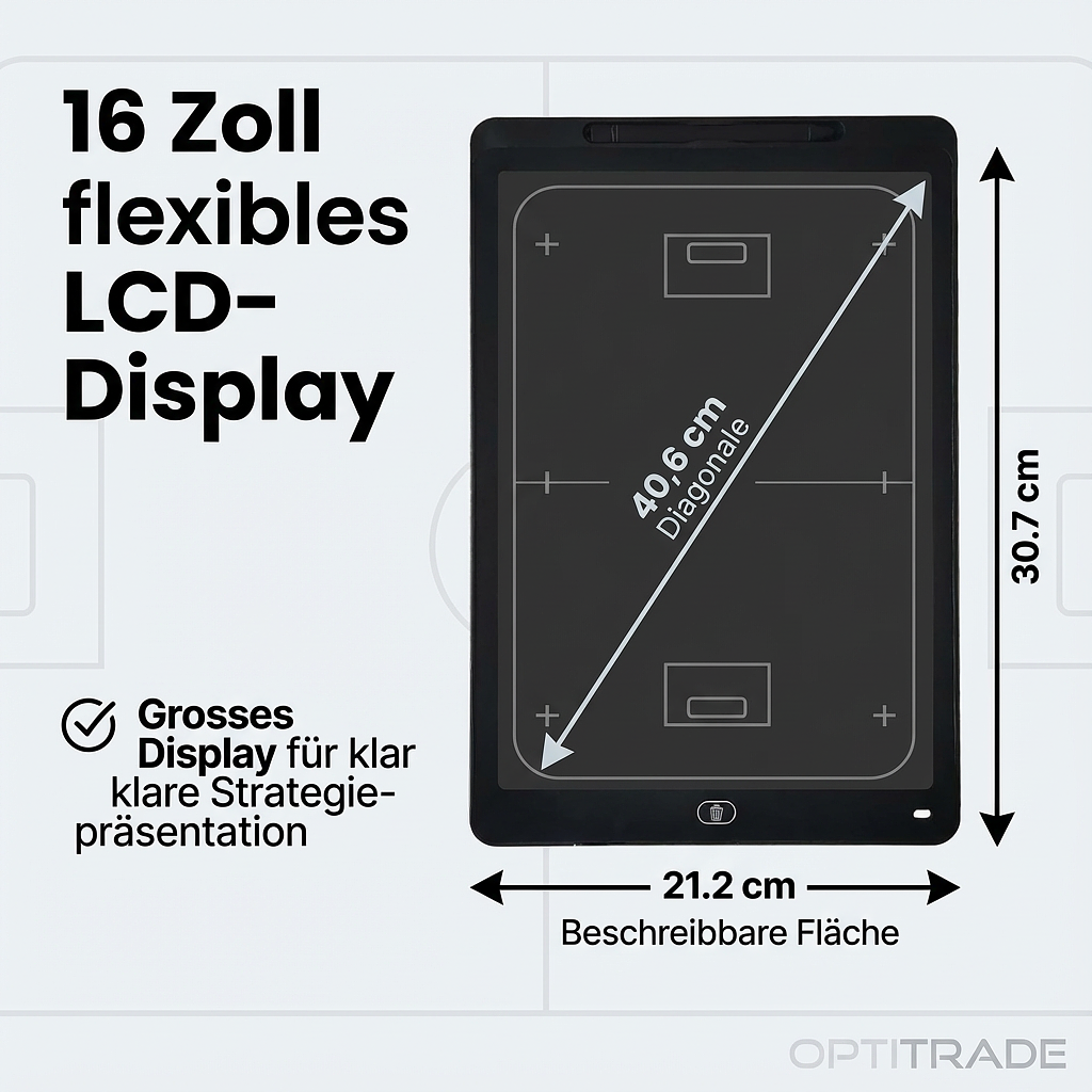 Mit dieser digitalen Strategietafel Sport kommunizieren Sie Spielzüge und Aufstellungen klar und präzise. Das grosse, flexible 16-Zoll-LCD-Display sorgt dafür, dass alle Spieler die Strategie sofort verstehen und umsetzen können – ohne störende Reflexionen oder Hintergrundbeleuchtung.