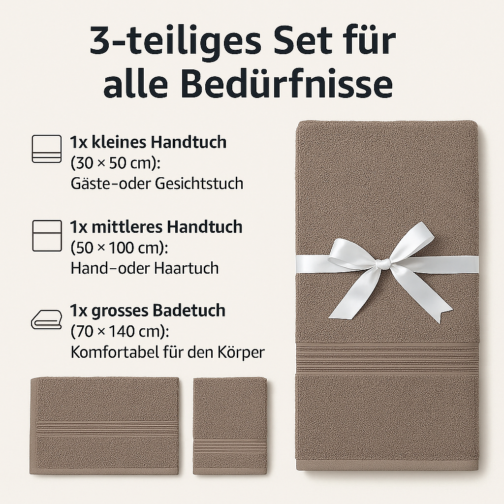– 1x mittleres Handtuch: 50 × 100 cm (Perfekt als Hand- oder Haartuch)