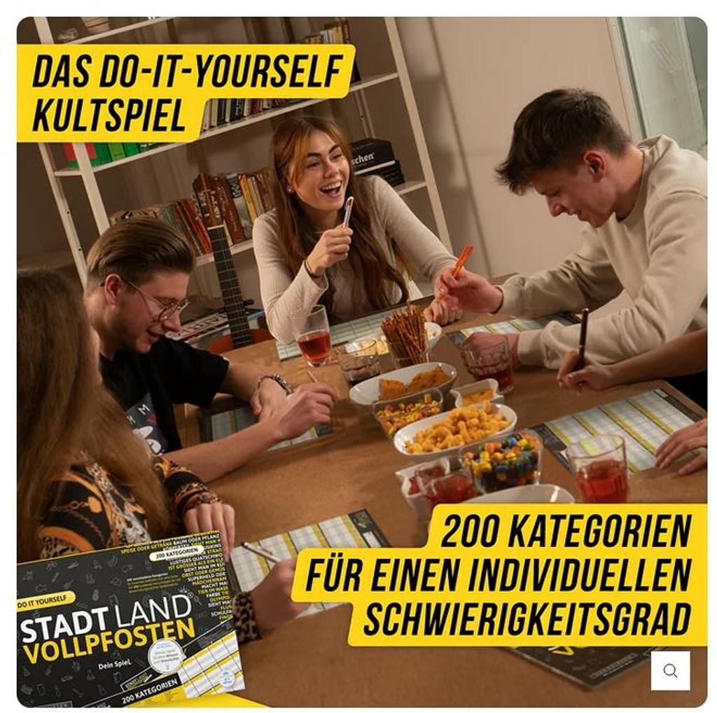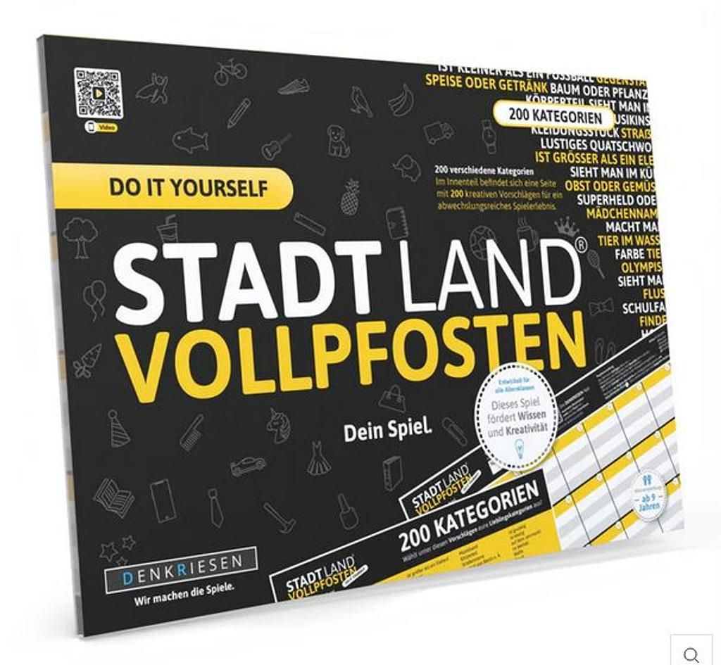 Die offizielle „Do It Yourself-Edition“ der kreativen Stadt-Land-Fluss Variante STADT LAND VOLLPFOSTEN® bietet endlosen Spielspass mit individueller Die STADT LAND VOLLPFOSTEN® – Do It Yourself Edition kombiniert klassischen Spielspass mit individueller Kreativität und strategischem Denken. Ideal für alle, die sich beim Spielen kreativ entfalten möchten und garantierten Spass suchen.