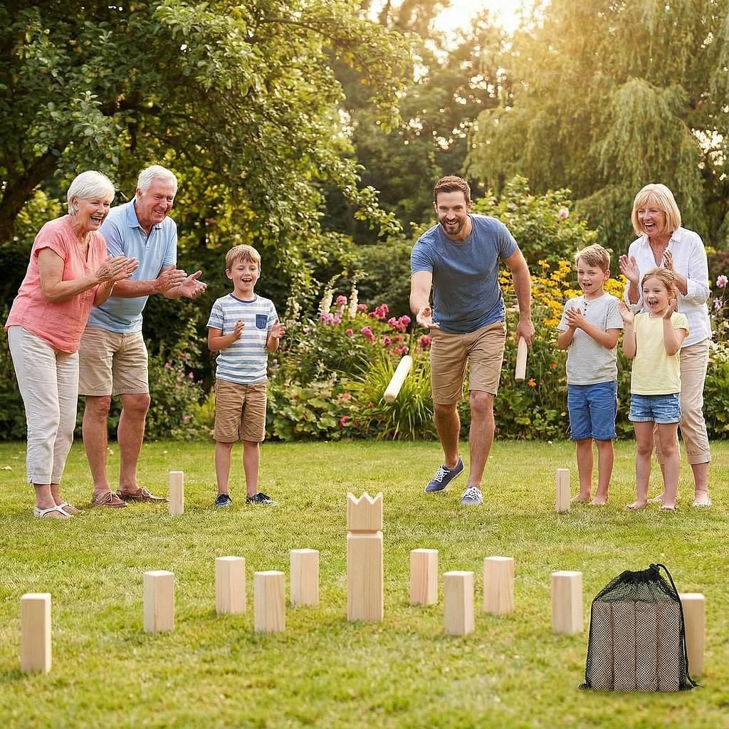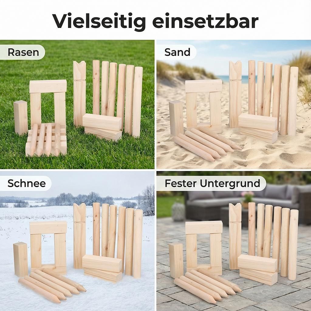 Ein grosser Vorteil von Kubb ist seine Vielseitigkeit. Sie können es auf nahezu jedem Untergrund spielen – sei es auf Rasen, Sand, Schnee oder festen Untergründen. Die Spielfläche lässt sich einfach mit den mitgelieferten Grenzhölzern abstecken. Die robusten Holzelemente garantieren eine lange Lebensdauer, sodass Sie viele Sommer lang Freude an diesem Spiel haben werden.