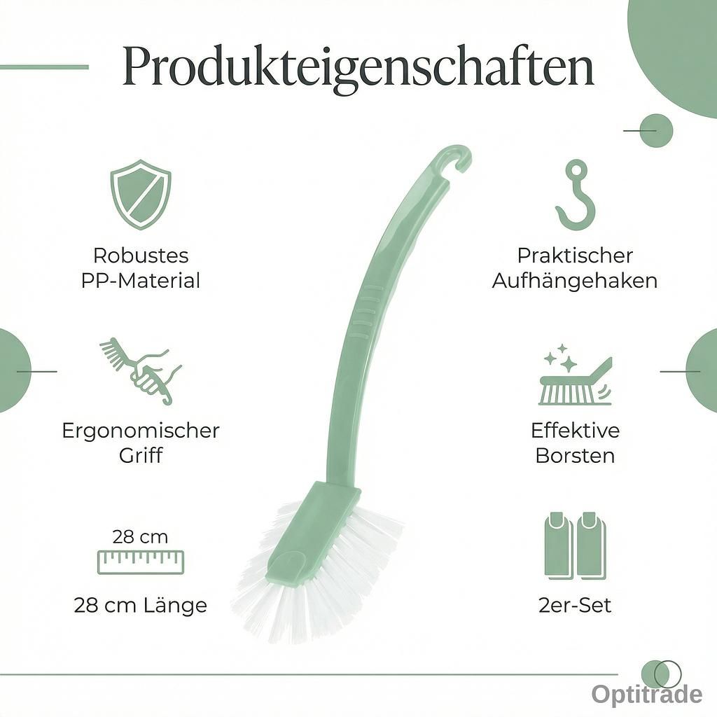 Dieses Set bietet Ihnen zwei robuste Spülbürsten, die perfekt für die tägliche Geschirrwäsche geeignet sind. Dank ihrer effektiven Reinigungsleistung entfernen sie mühelos Essensreste und Schmutz von Tellern, Töpfen und Gläsern.