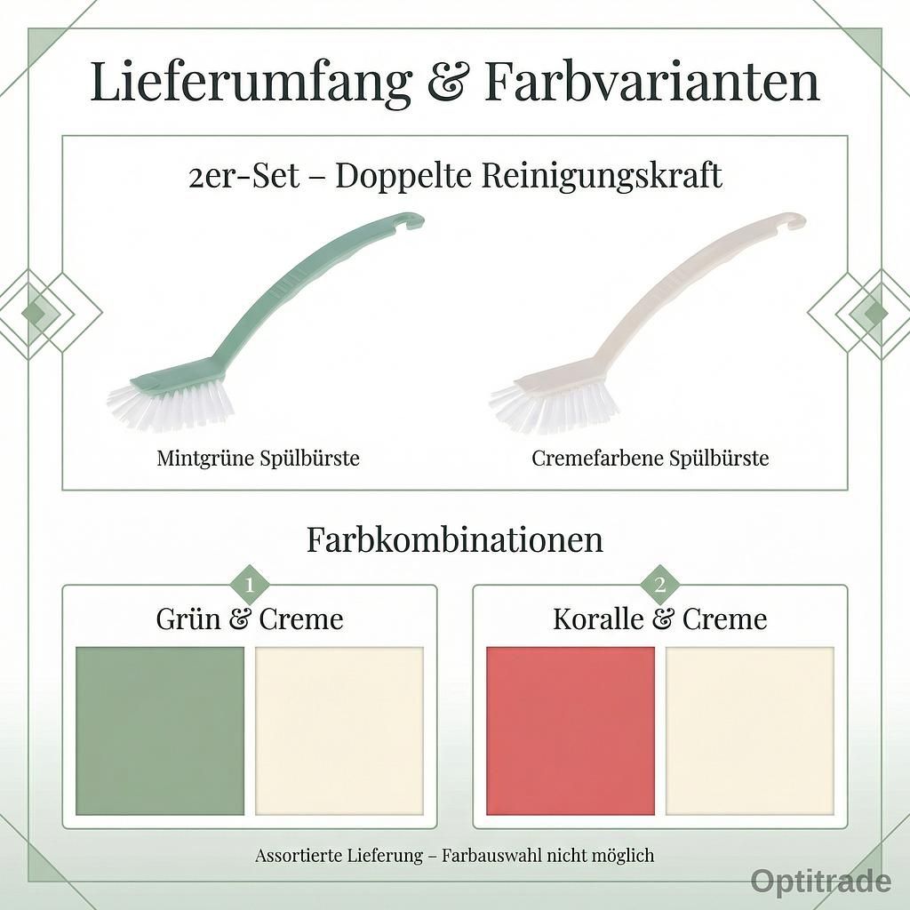 Die Geschirrspülbürsten werden assortiert geliefert, wobei zwei Farbkombinationen möglich sind: Koralle & Creme oder Grün & Creme. Eine spezifische Farbauswahl ist leider nicht möglich, der Preis gilt pro Set.