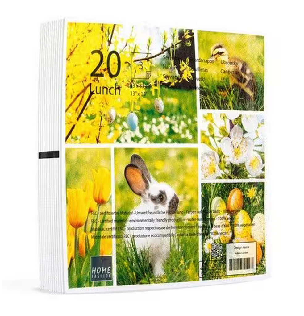 Die ‚Easter Collage‘ Servietten präsentieren sich mit liebevollen Motiven wie Hasen, Eiern und frühlingshaften Blumen, die sofort gute Laune verbreiten. Gefertigt aus hochwertigem, 3-lagigem Tissue-Material, bieten diese Frühlingsservietten nicht nur eine ansprechende Optik, sondern auch eine angenehme Haptik und hohe Saugfähigkeit. Ob für die Tischdekoration oder kreative Serviettentechniken, diese Servietten Hasen Eier sind vielseitig einsetzbar.