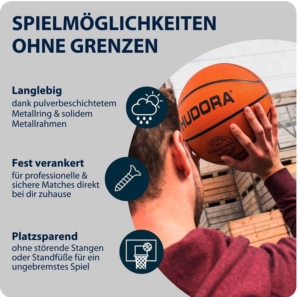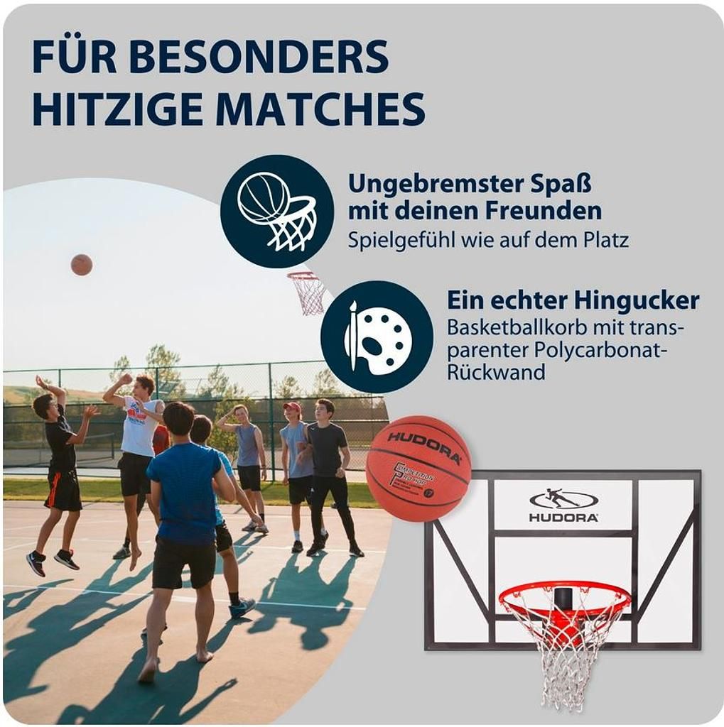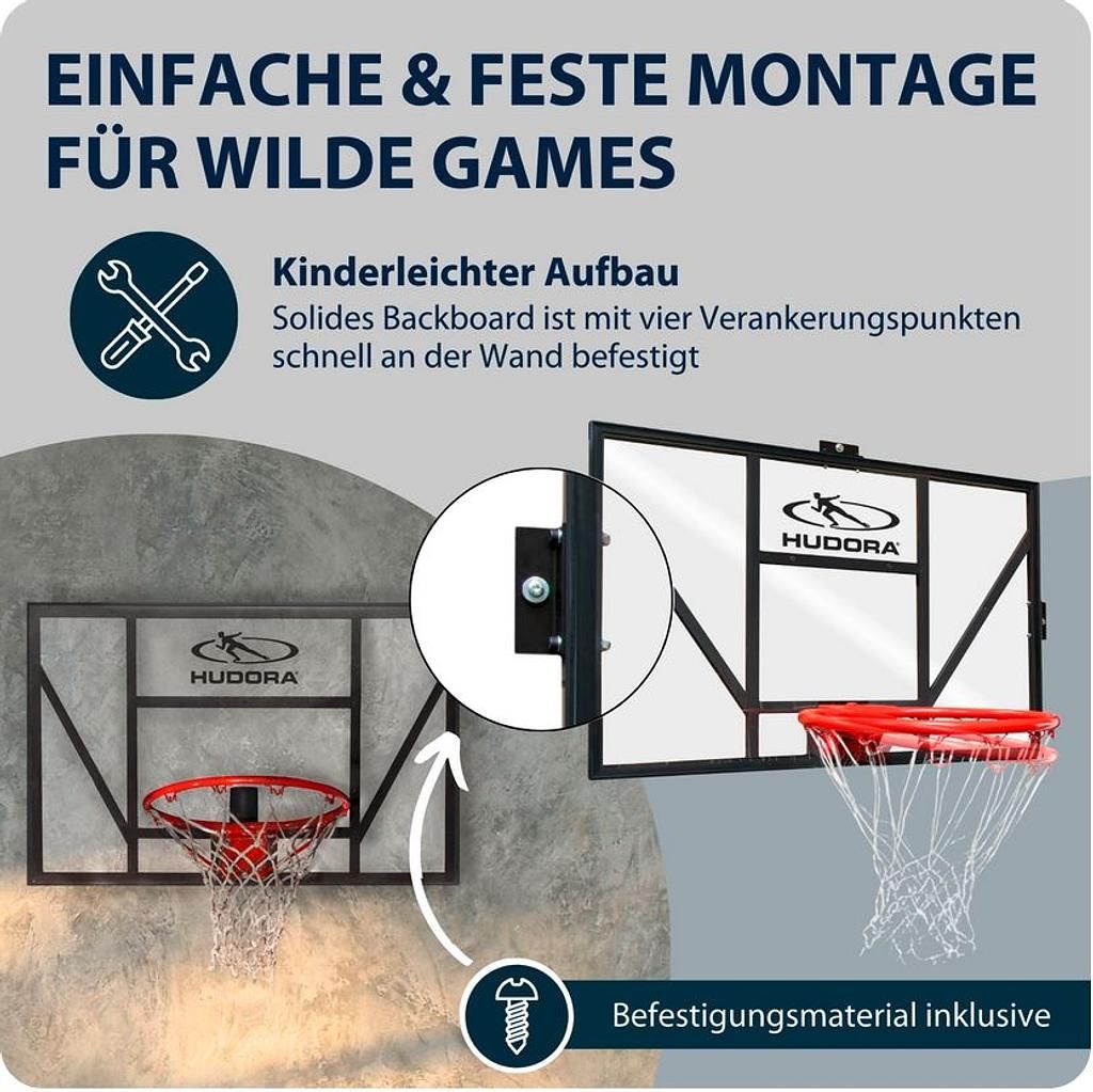 Kurzes Dribbling, zack und drin! Das Competition Pro mit einer Fläche von 110 x 70 cm verspricht jede Menge Basketball-Spaß! Das feste Backboard besteht aus einem soliden Metallrahmen, das transparente Rückbrett aus robustem Polycarbonat. Mit vier Verankerungspunkten lässt es sich kinderleicht an der Wand befestigen. Ob alleine oder mit Freunden: Das Hudora Basketball Board mit (stark) federndem Dunkring fordert zu coolen Slamdunks auf.