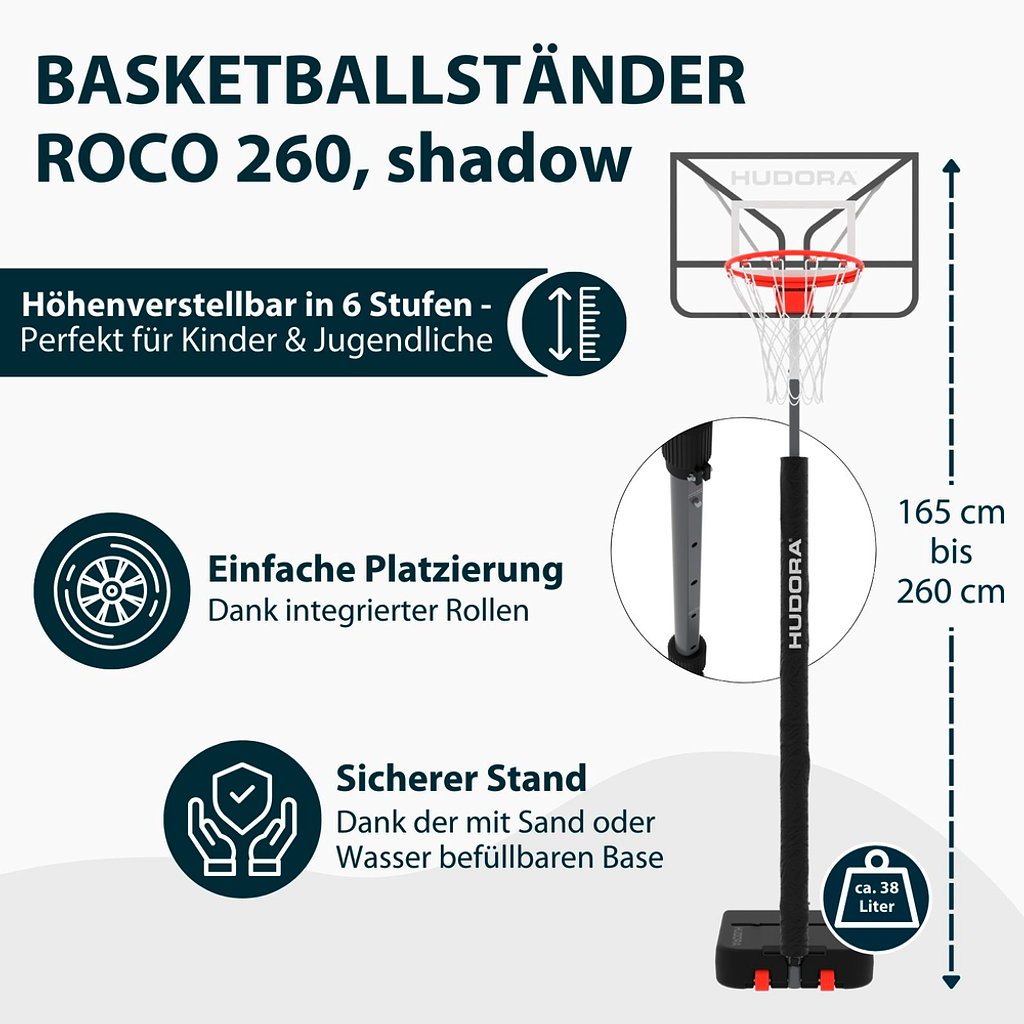 Die Basketballanlage höhenverstellbar passt sich perfekt an alle Altersgruppen an. Mittels des BW-Verstellmechanismus lässt sich die Höhe in 6 Stufen von 165 cm bis 260 cm einstellen. So ist der Hudora Basketballständer sowohl für Kinder als auch für Erwachsene geeignet und wächst mit den Ansprüchen der Spieler mit.