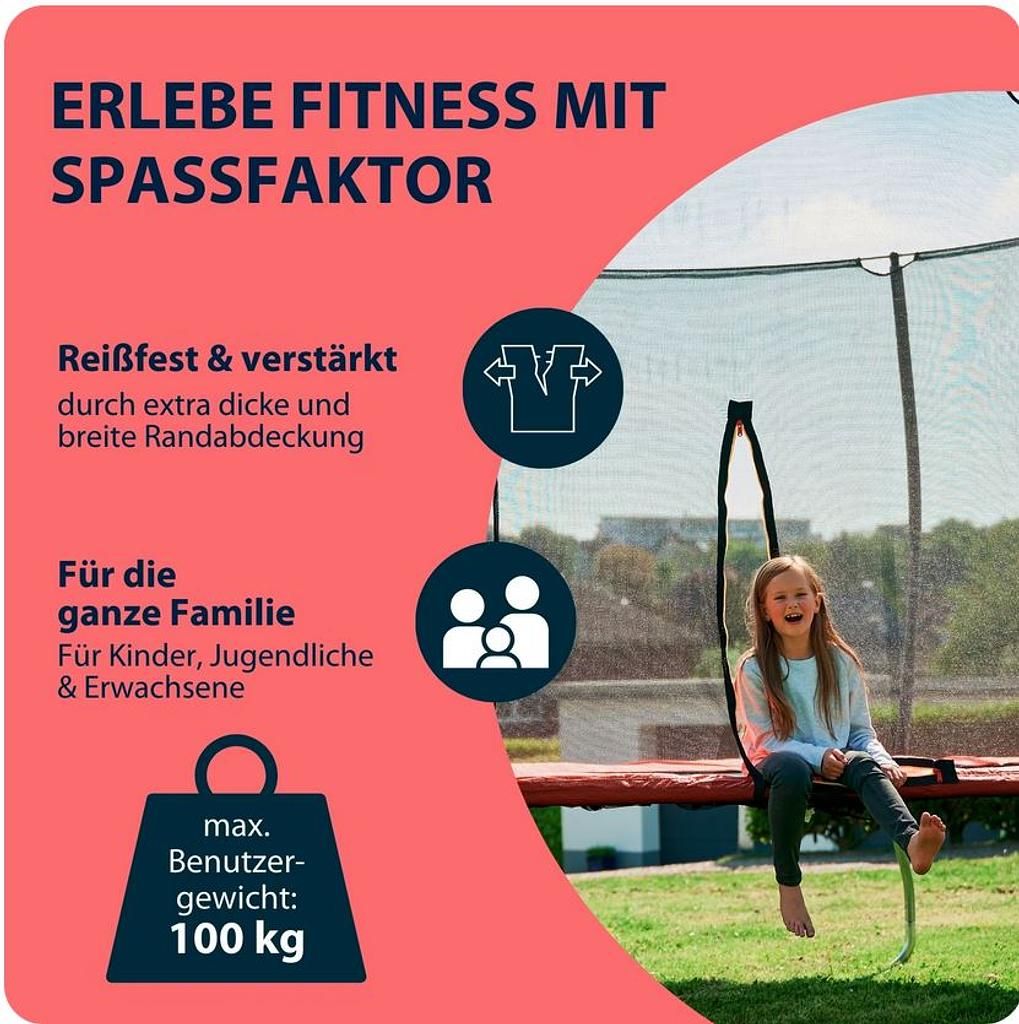 Dieses Outdoor Trampolin rot ist ausschliesslich für den Hausgebrauch konzipiert und nur für einen Benutzer gleichzeitig zugelassen (Kollisionsgefahr). Bitte beachten Sie, dass rund um das Trampolin 2 m freier Raum benötigt werden. Das Produkt ist nicht für Kinder unter 36 Monaten geeignet.