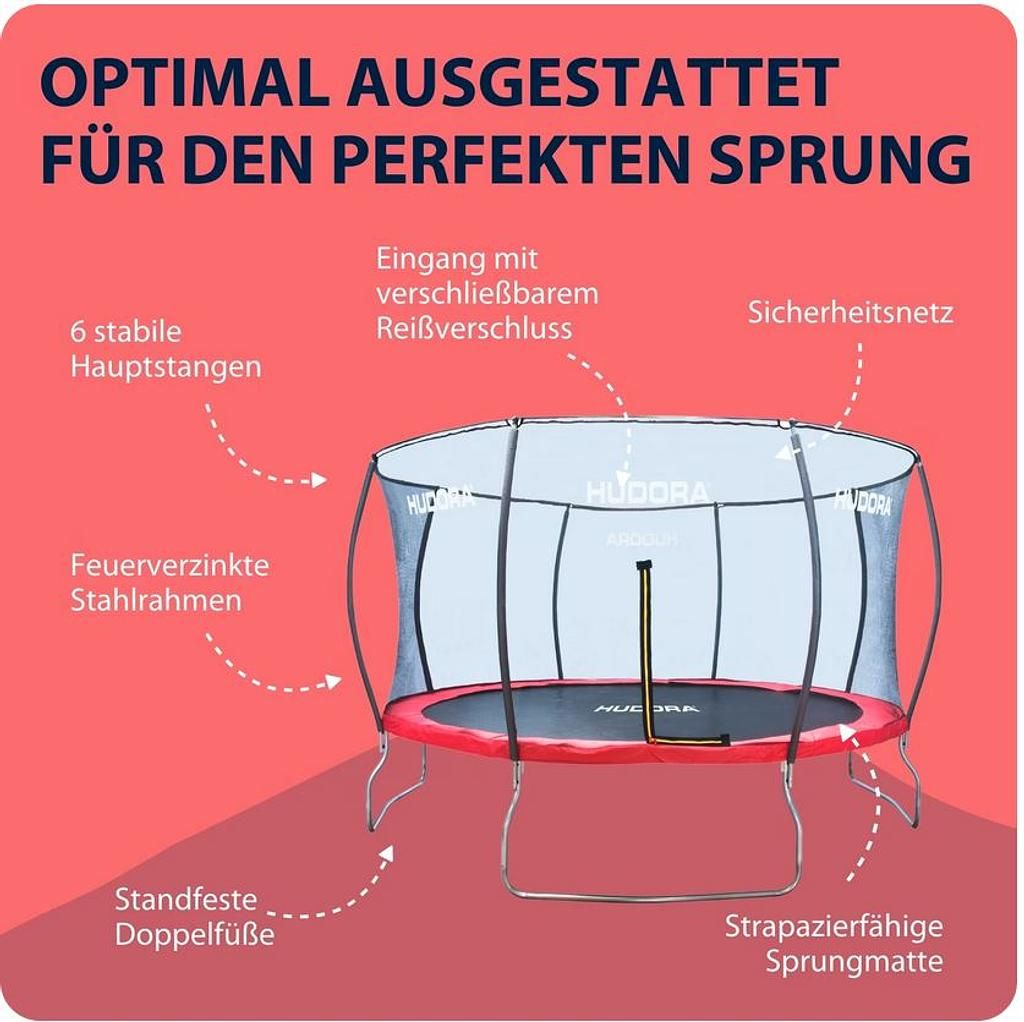 Die hochwertige Sprungmatte ist mit 80 Federn fixiert, was eine sehr gute Sprungbeschleunigung ermöglicht. Die extra breite und dicke Randabdeckung aus reissfestem, nylonverstärktem Tarpaulin schützt zuverlässig vor den Federn. Vier standfeste Doppelfüsse sorgen für einen jederzeit sicheren Stand, sodass Sie das Hudora Trampolin kaufen und sofort loslegen können.