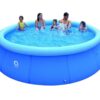 Der aufblasbare Pool mit den Maßen 4,20 x 0,84 m ist das ideale Produkt für Ihren Garten. Einfach den Luftring aufblasen und beim Befüllen mit Wasser richtet sich der Pool von selbst auf – und schon steht das Planschbecken bereit!