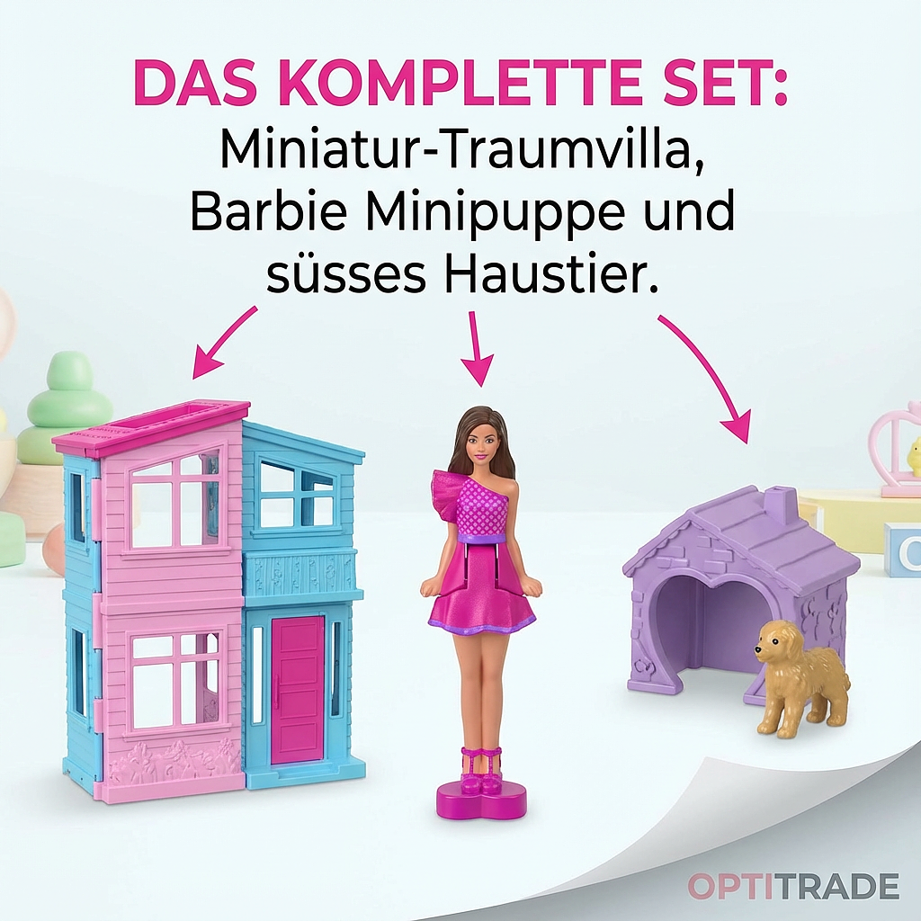 Erleben Sie die legendäre Barbie Traumvilla als faszinierende Miniatur. Jedes Set ist eine exakte Nachbildung und enthält eine Box mit einer Barbie Minipuppe, ihrem Haustier und passendem Tierzubehör. Diese Puppenhaus Miniatur Sets sind ein Muss für jeden Fan.