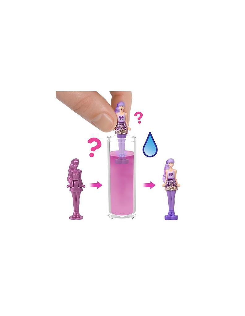 Öffnen Sie den kleinen Behälter und entdecken Sie Ihre komplett durchgefärbte Puppe. Der wahre Spass beginnt, wenn Sie den Behälter mit heissem Wasser füllen, die Puppe hineinlegen und schütteln. Sobald sich das Wasser färbt, enthüllt sich Ihre einzigartige Barbie Color Reveal Figur – welche Überraschung erwartet Sie heute?